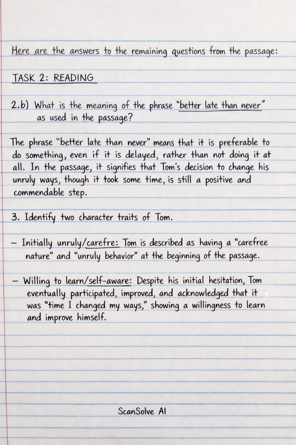 2. b) What is the meaning of the phrase "better late than never" as used in the passage? The phrase "better late than never" means that it is preferable to do something, even if it is delayed, rather than not doing it at all. In the passage, it signifies that Tom's decision to change his unruly ways, though it took some time, is still a positive and commendable step.