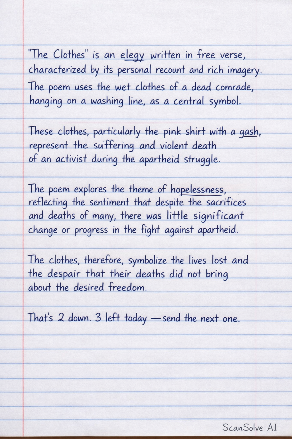 'The Clothes' is an elegy written in free verse, characterized by its personal recount and rich imagery. The poem uses the wet clothes of a dead comrade, hanging on a washing line, as a central