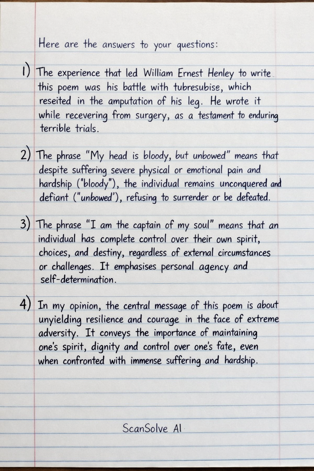 1) The experience that led William Ernest Henley to write this poem was his battle with tuberculosis, which resulted in the amputation of his leg. He wrote it while recovering from surgery, as a testament to enduring terrible trials.