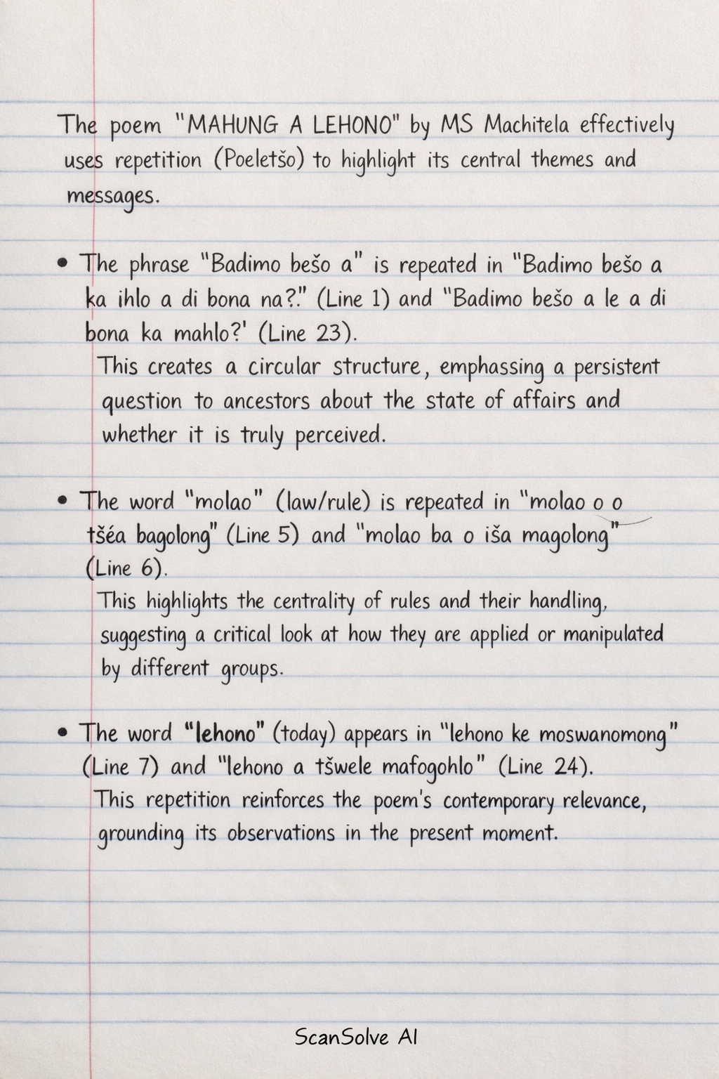 The poem "MAHUNG A LEHONO" by MS Machitela effectively uses repetition (Poeletšo) to highlight its central themes and messages.