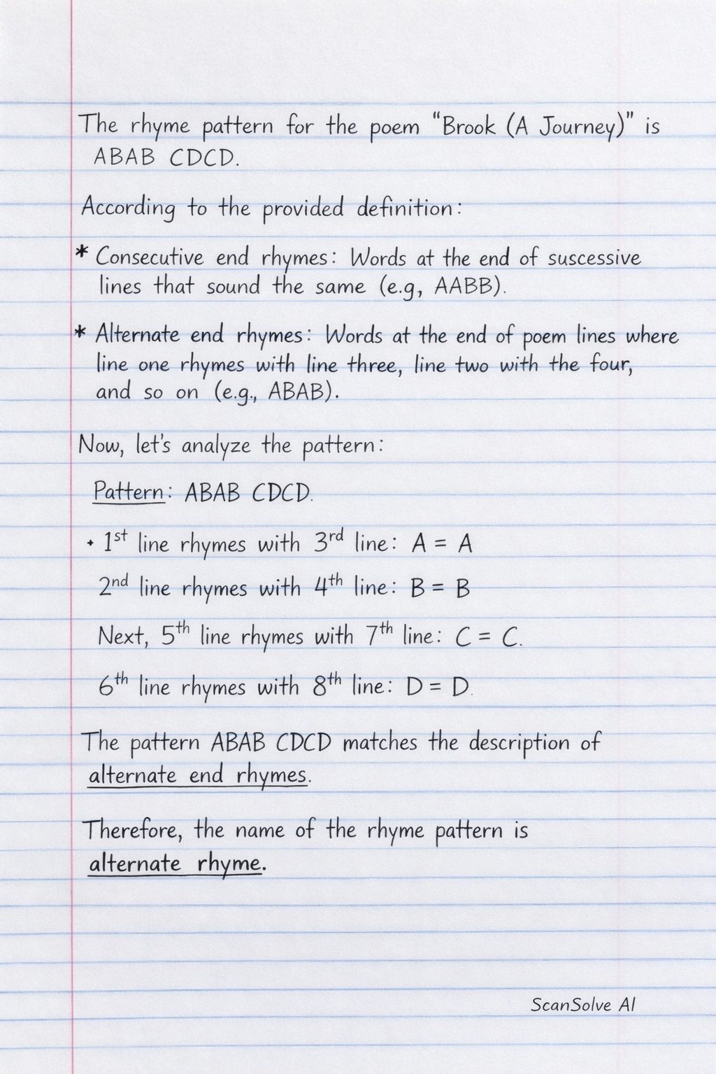 The rhyme pattern for the poem "Brook (A Journey)" is ABAB CDCD. According to the provided definition: