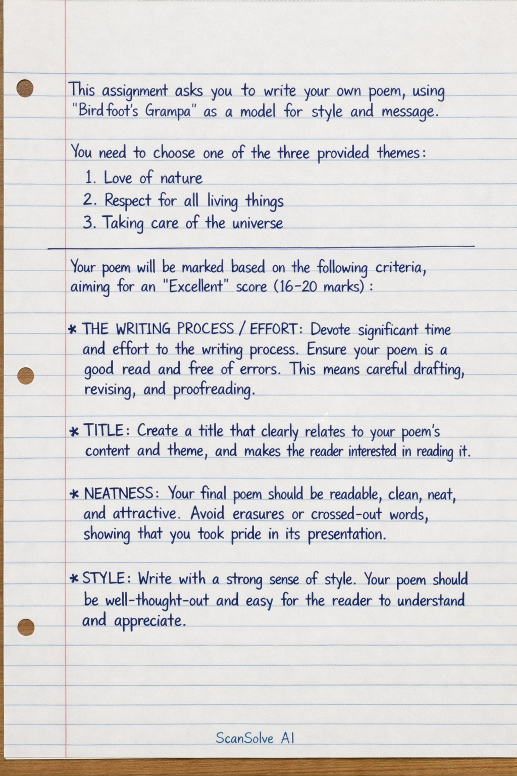 Your poem will be marked based on the following criteria, aiming for an "Excellent" score (16-20 marks):