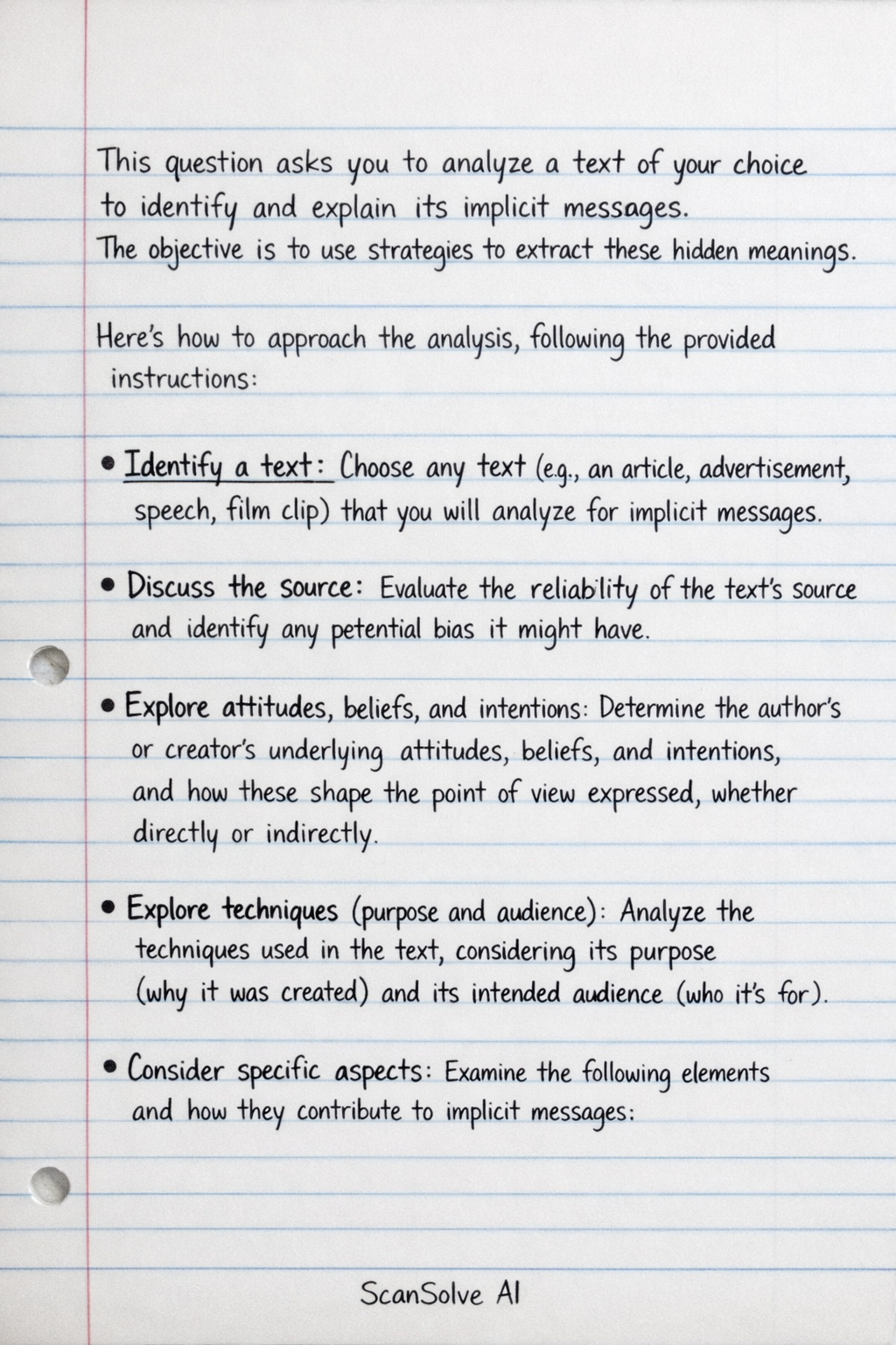 This question asks you to analyze a text of your choice to identify and explain its implicit messages. The objective is to use strategies to extract these hidden meanings.