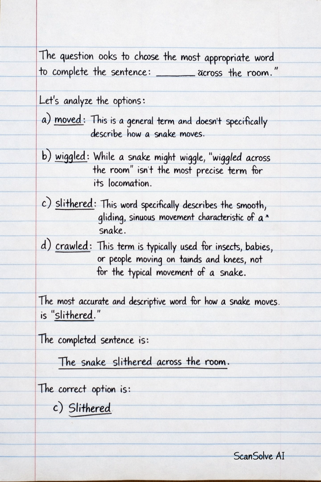 - c) slithered: This word specifically describes the smooth, gliding, sinuous movement characteristic of a snake.