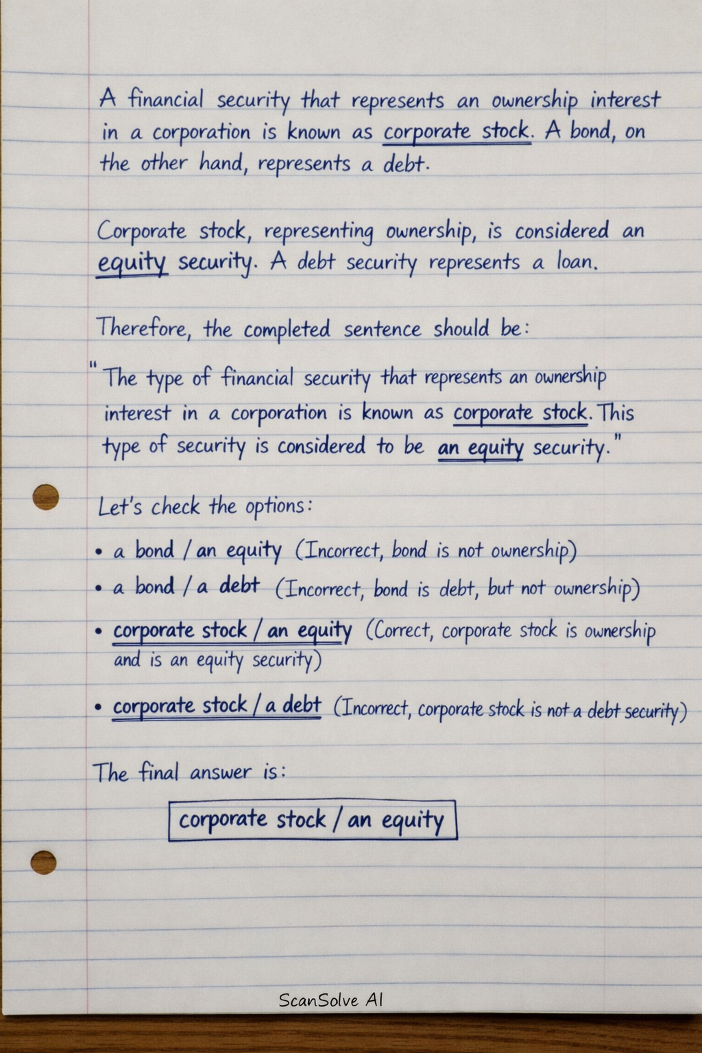 The question asks to complete a sentence about financial securities.