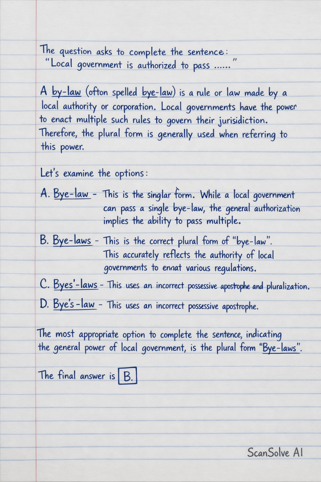 B. Bye-laws - This is the correct plural form of "bye-law". This accurately reflects the authority of local governments to enact various regulations.