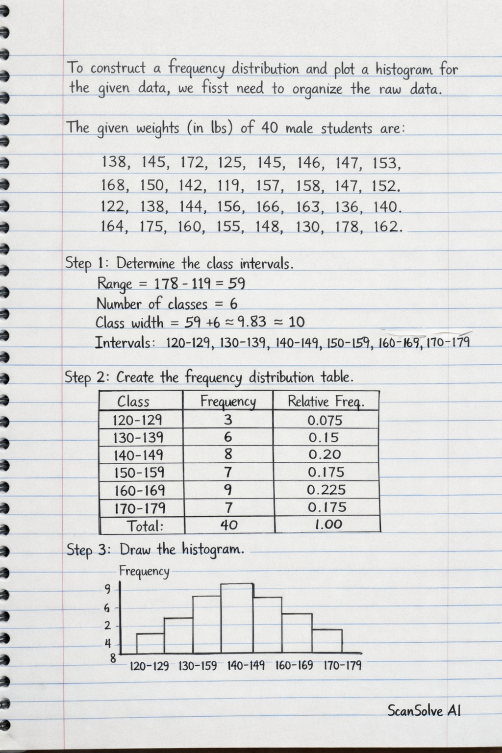 The given weights (in lbs) of 40 male students are: 138, 145, 172, 125, 145, 146, 147, 153 168, 150, 142, 119, 157, 158, 147, 152 122, 138, 144, 156, 165, 173, 136, 140 164, 1