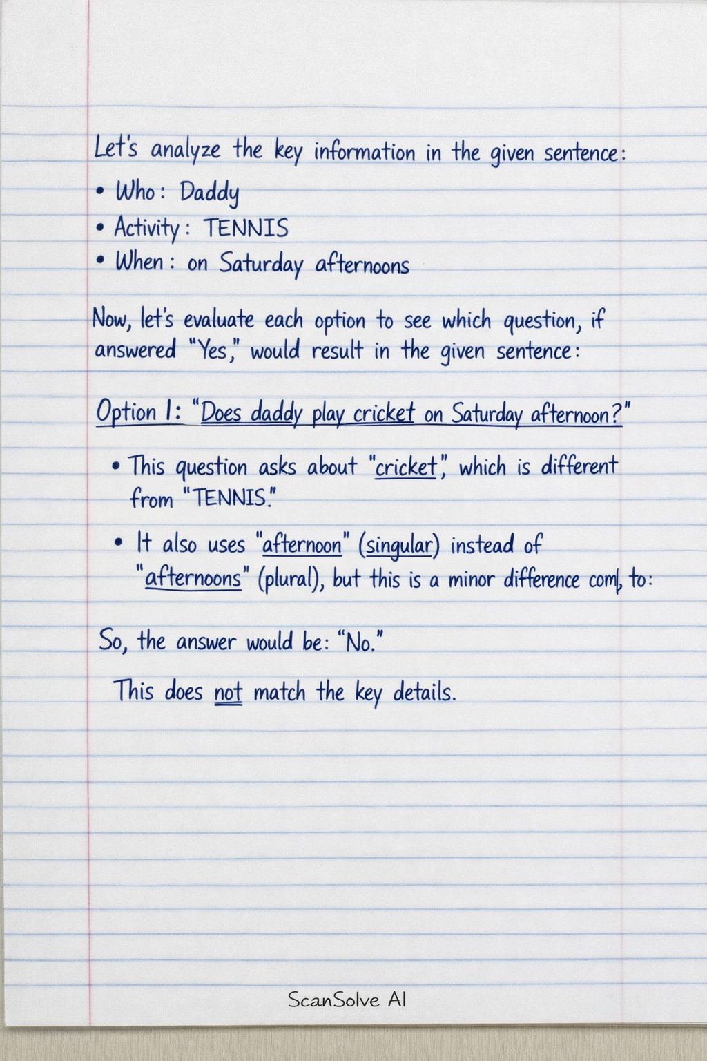 us to identify which of the given questions is appropriately answered by the sentence: "Daddy plays TENNIS on Saturday afternoons."