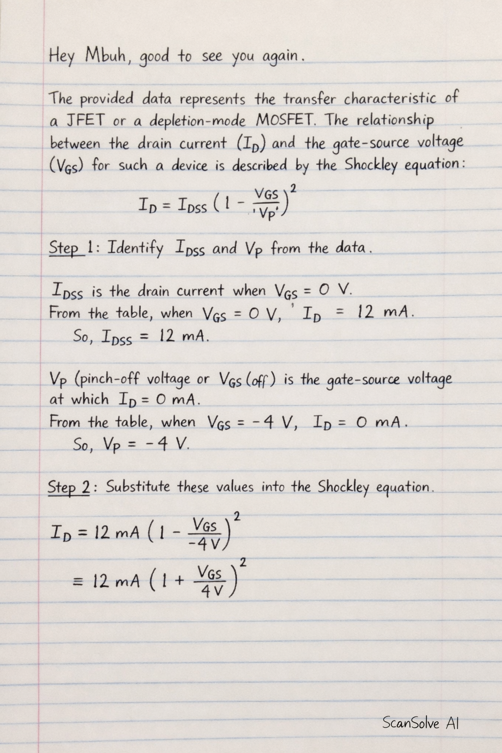 Step 1: Identify and from the data. is the drain current when V. From the table, when V, mA. So, .