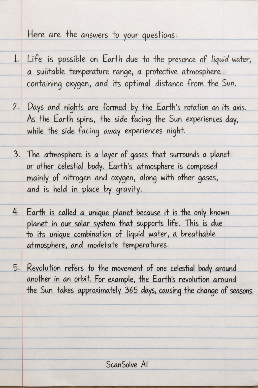 Life is possible on Earth due to the presence of liquid water, a suitable temperature range, a protective atmosphere containing oxygen, and its optimal distance from the Sun.