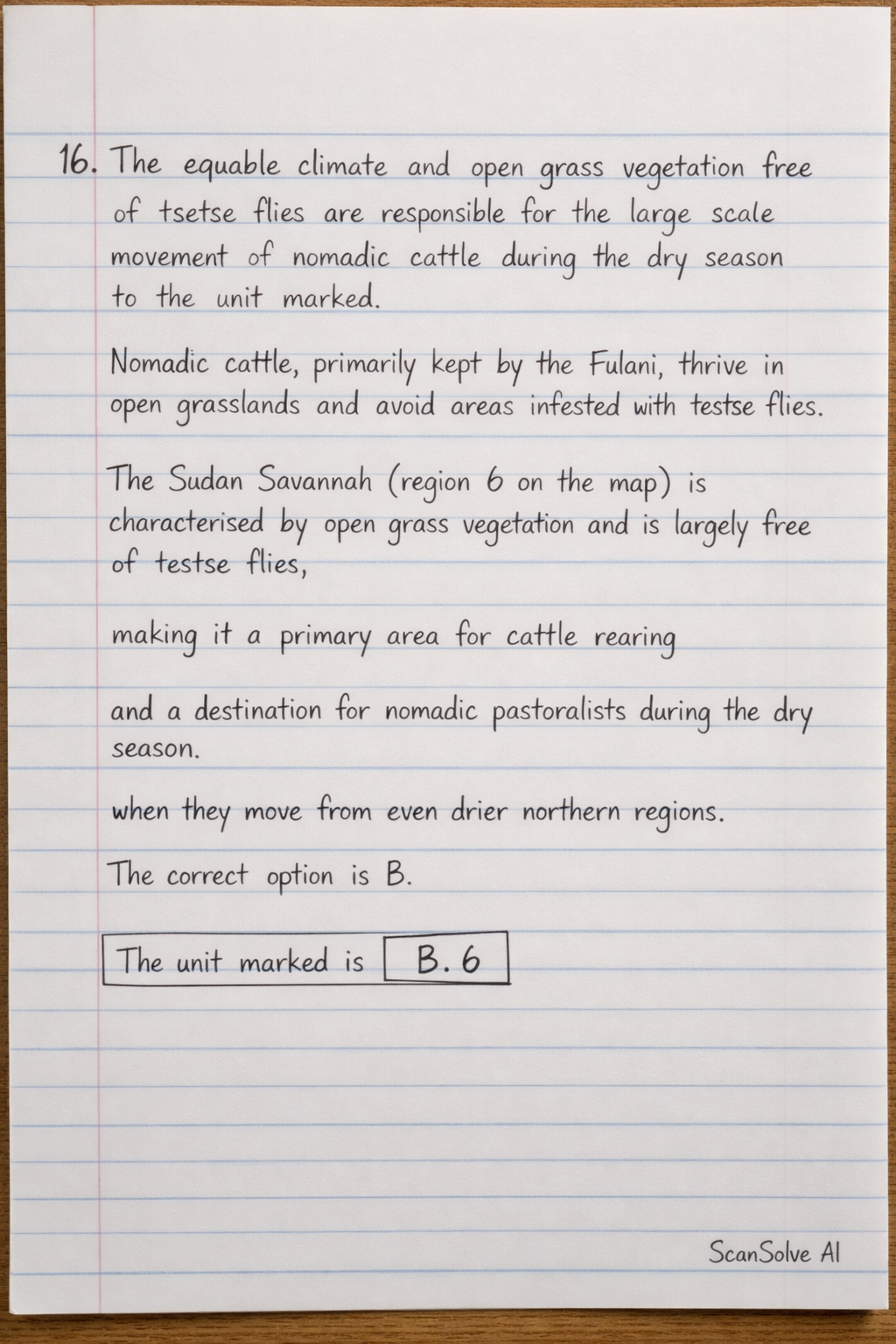 16. The equable climate and open grass vegetation free of tsetse flies, are responsible for the large scale movement of nomadic cattle during the dry season to the unit marked