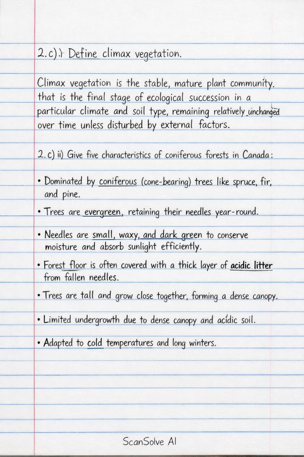 2. c) ii) Give five characteristics of coniferous forests in Canada.