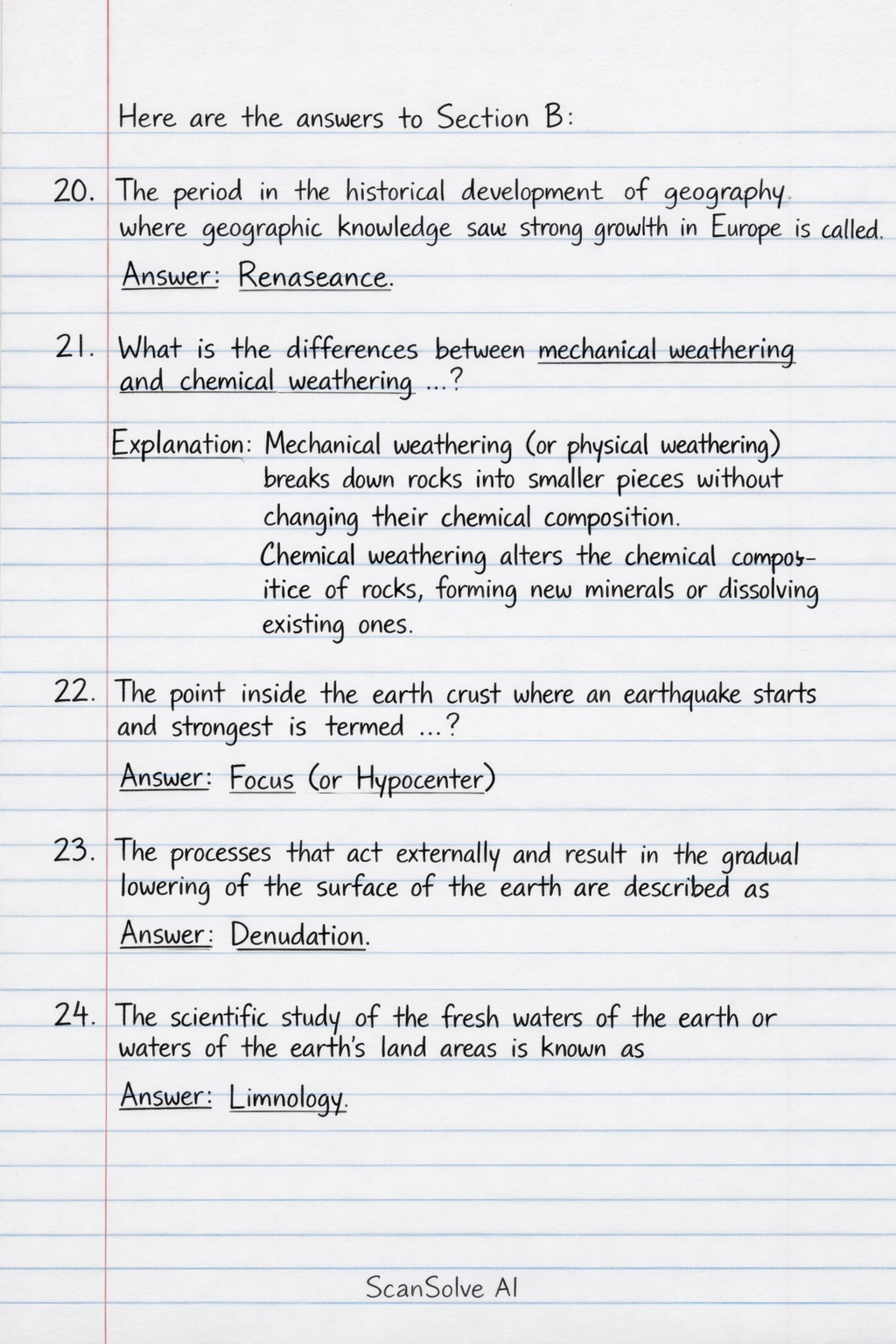 - Explanation: Mechanical weathering (or physical weathering) breaks down rocks into smaller pieces without changing their chemical composition. Chemical weathering alters the chemical composition of rocks, forming new minerals or dissolving existing ones.