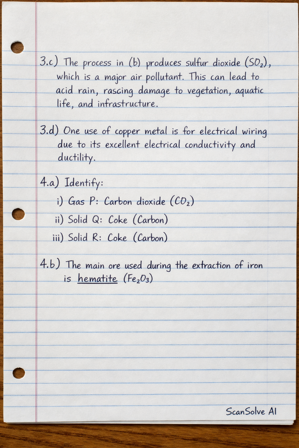 3.c) The process in (b) produces sulfur dioxide (SO_2), which is a major air pollutant. This can lead to acid rain, causing damage to vegetation, aquatic life, and infrastructure.