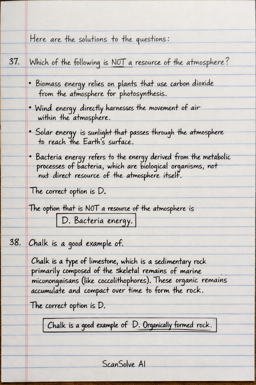 38. Chalk is a good example of Chalk is a type of limestone, which is a sedimentary rock primarily composed of the skeletal remains of marine microorganisms (like coccolithophores). These organic remains accumulate and compact over time to form the rock. The correct option is D. Chalk is a good example of .