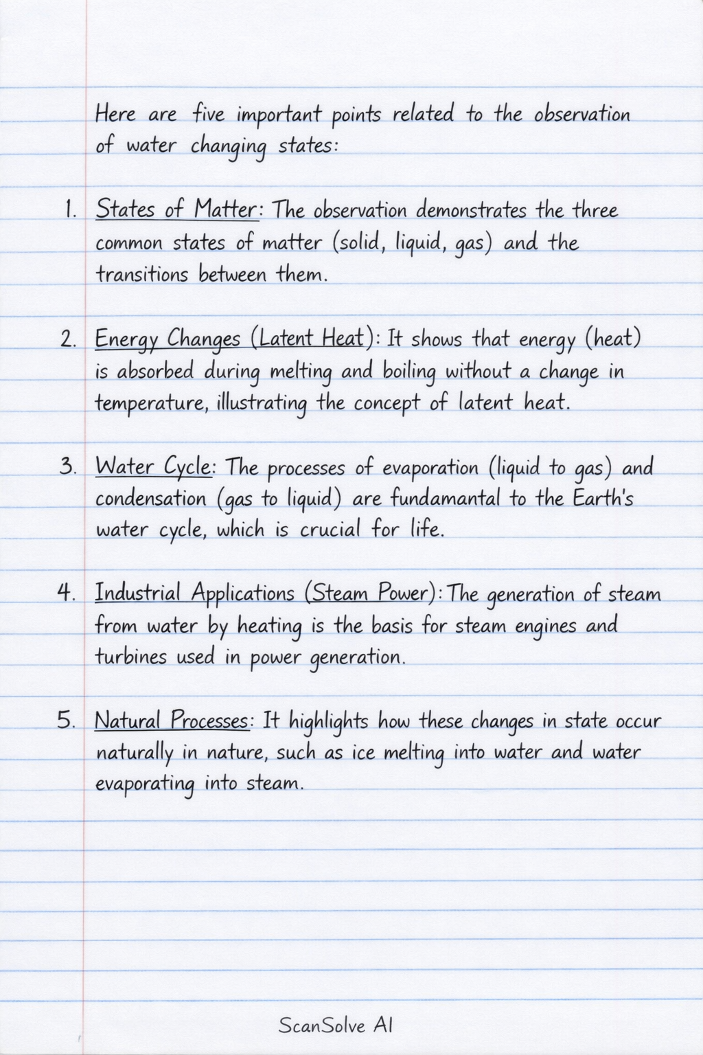 - States of Matter: The observation demonstrates the three common states of matter (solid, liquid, gas) and the transitions between them.