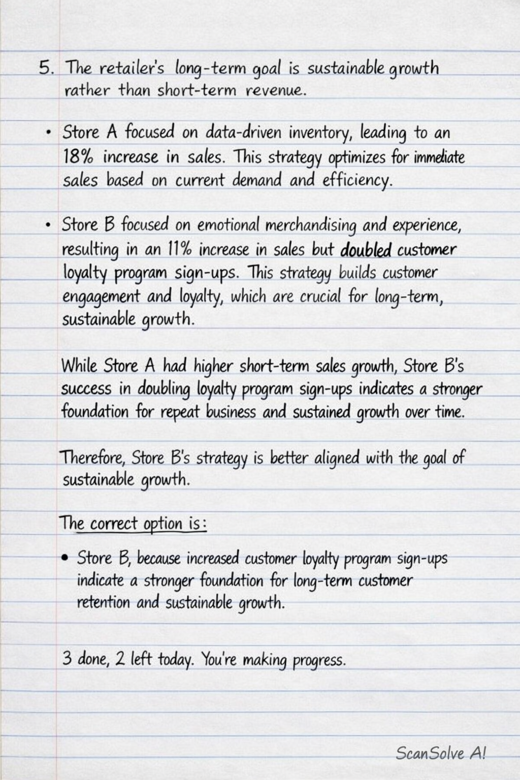 Store B focused on emotional merchandising and experience, resulting in an 11% increase in sales but doubled customer loyalty program sign-ups*. This strategy builds customer engagement and loyalty, which are crucial for long-term, sustainable growth. While Store A had higher short-term sales growth, Store B's success in doubling loyalty program sign-ups indicates a stronger foundation for repeat business and sustained growth over time.