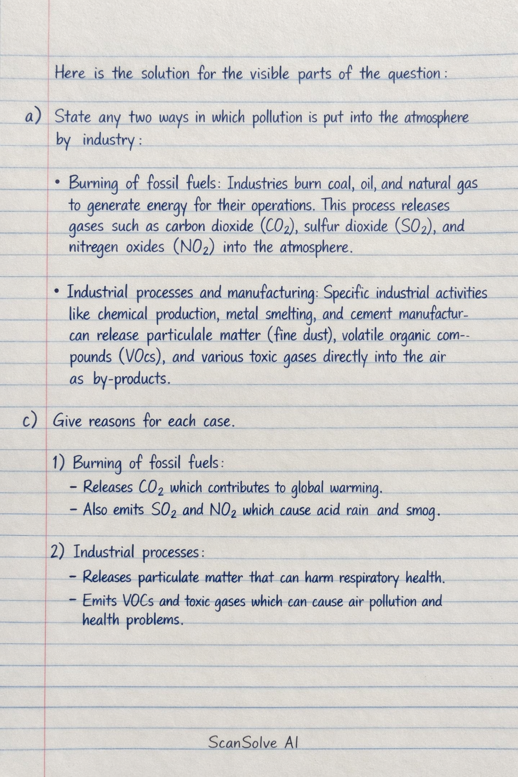 a) State any two ways in which pollution is put into the atmosphere by industry. Burning of fossil fuels*: Industries burn coal, oil, and natural gas to generate energy for their operations.