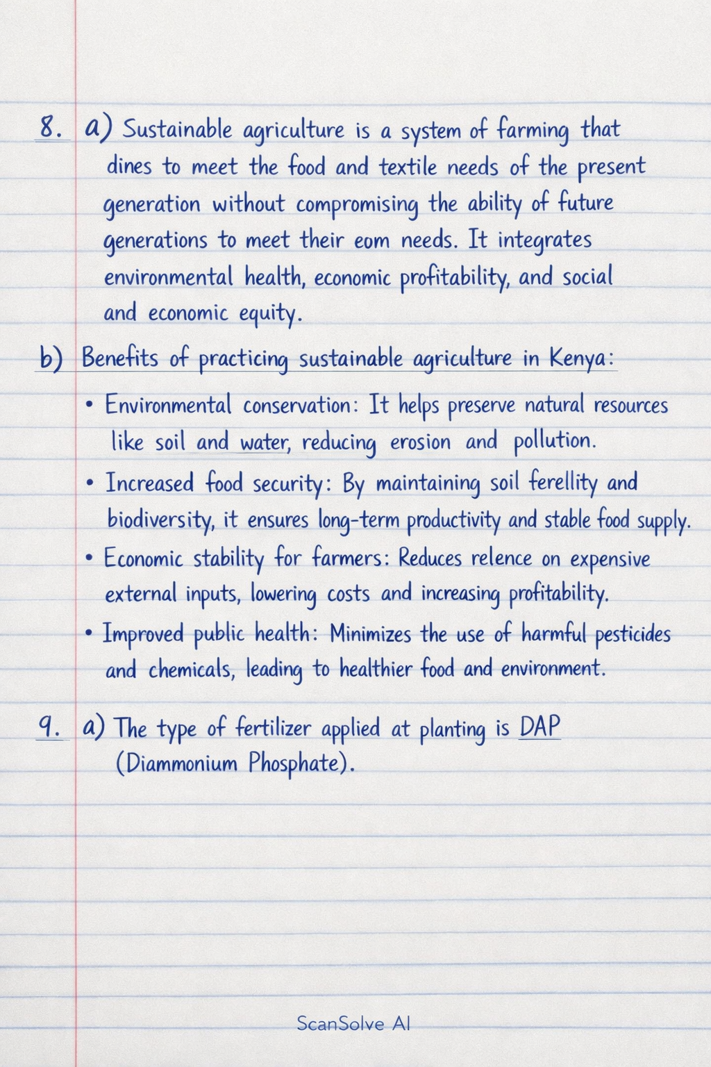 8. a) Sustainable agriculture is a system of farming that aims to meet the food and textile needs of the present generation without compromising the ability of future generations to meet their own needs.