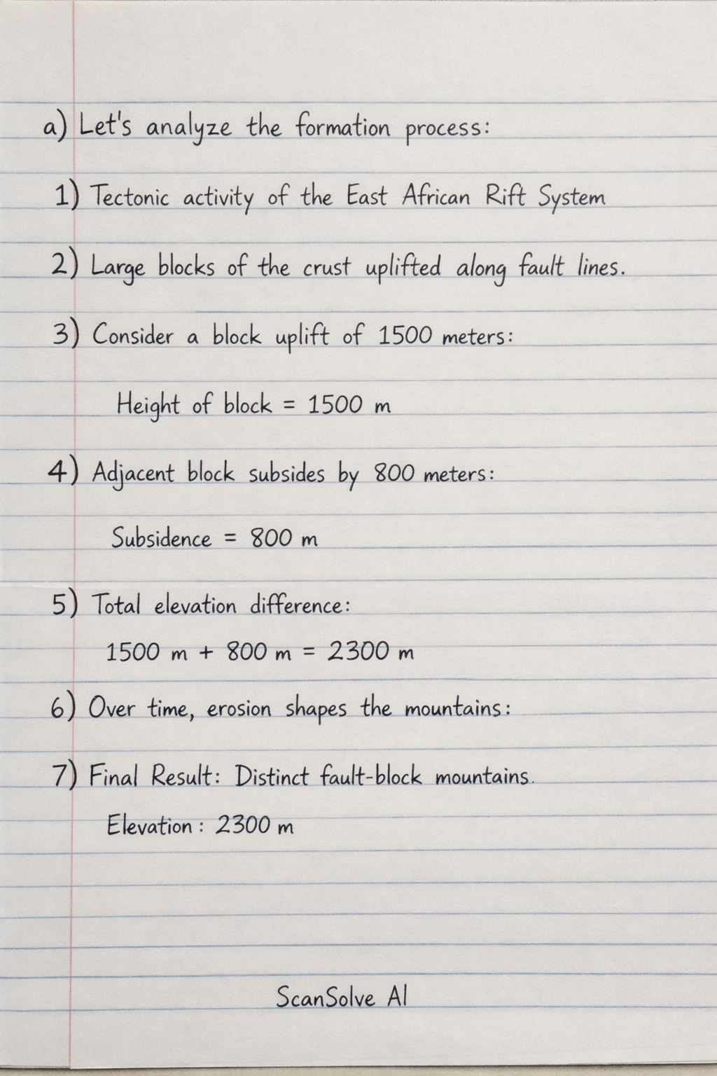a) The mountains identified in the scenario, such as Rwenzori and Usambara, are primarily fault-block mountains. Their formation is linked to the tectonic activity of the East African Rift System. This process involves the uplift of large blocks of the Earth's crust along fault lines, while adjacent blocks may subside. Over geological time, these elevated blocks are further shaped by erosion, resulting in the distinct mountain ranges seen today.