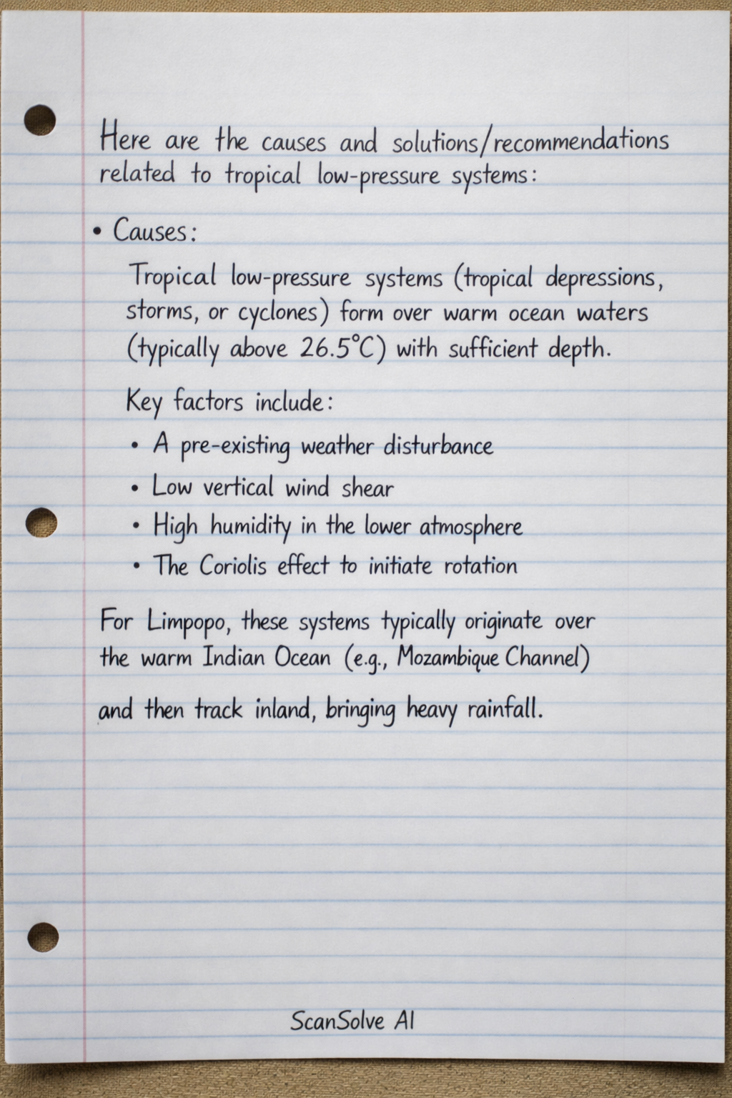 Causes: Tropical low-pressure systems (tropical depressions, storms, or cyclones) form over warm ocean waters (typically above 26.5∘C) with sufficient depth. Key factors include a pre-existing weather disturbance, low vertical wind shear, high humidity in the lower atmosphere, and the Coriolis effect to initiate rotation. For Limpopo, these systems typically originate over the warm Indian Ocean (e.g., Mozambique Channel) and then track inland, bringing heavy rainfall.