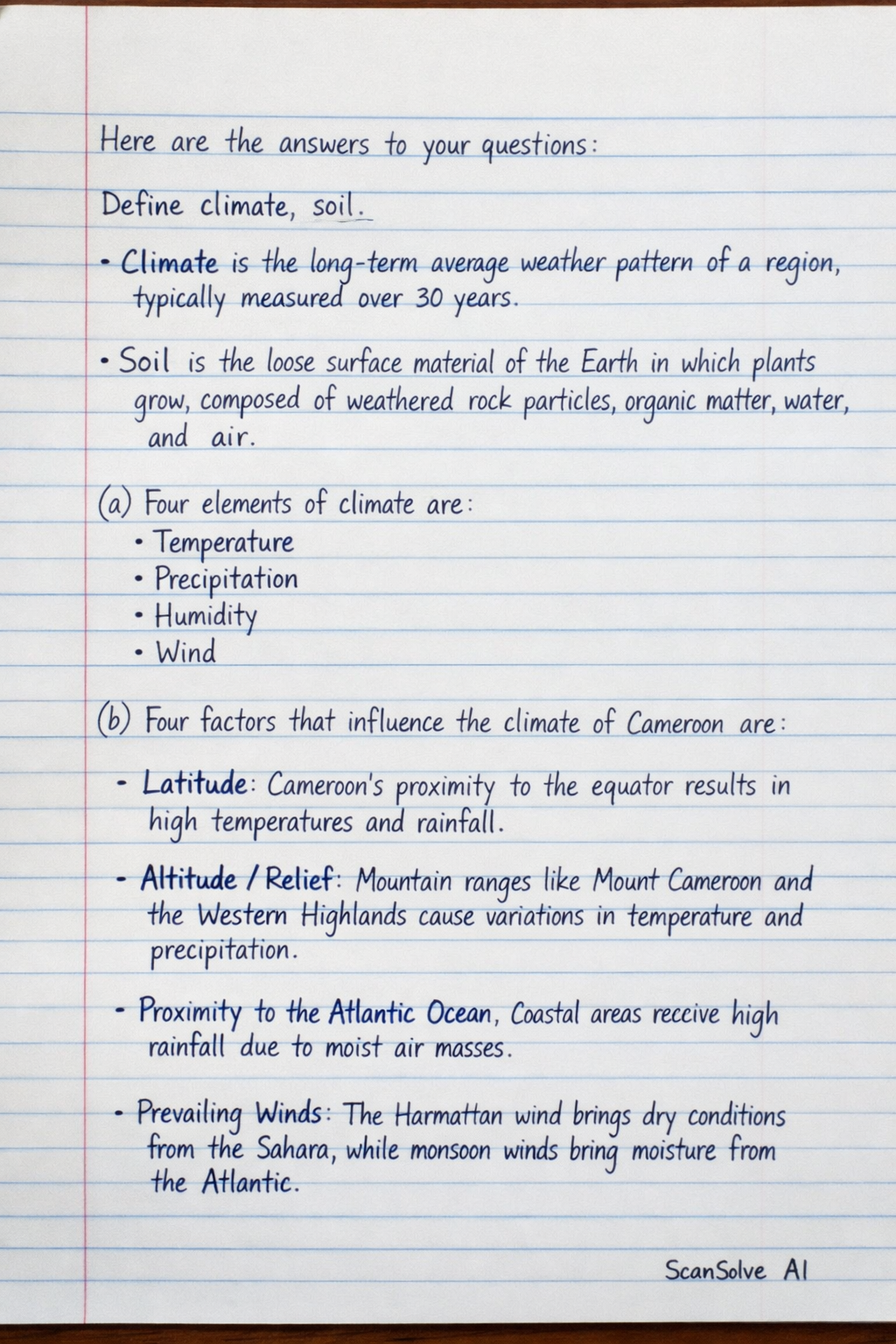 - Altitude/Relief: Mountain ranges like Mount Cameroon and the Western Highlands cause variations in temperature and precipitation.