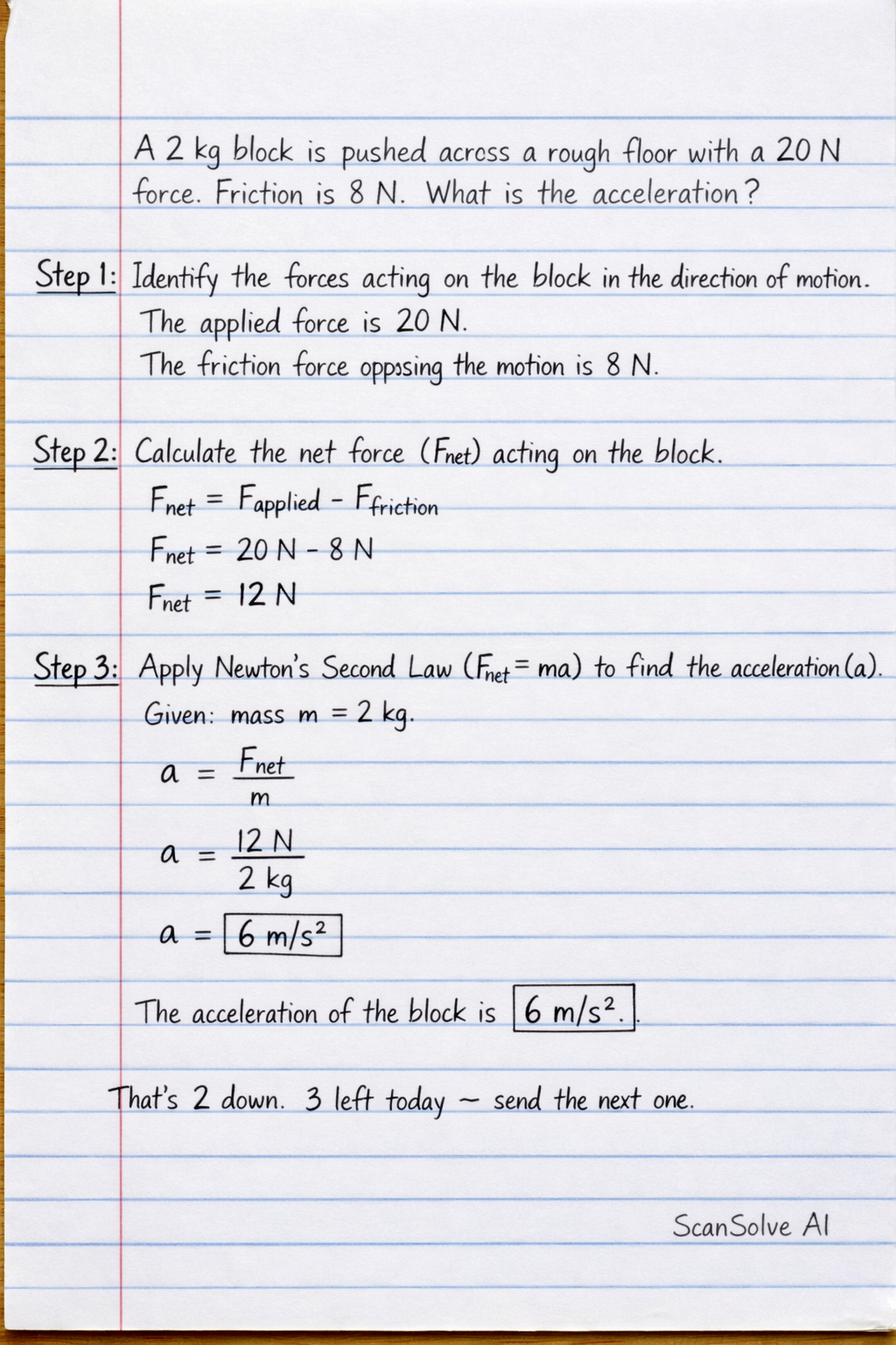 Example 1: A 5 kg block A rests on a frictionless table and is connected by a light string over a pulley to a 3 kg block B hanging vertically. Find the acceleration of the system and the tension in the string. Take g = 9.8 m/s^2. Solution: 1. Free body diagram + Law 1/3: For block A, normal force balances its weight. Tension T pulls it right. For block B, weight mB g pulls down, tension T pulls up. Action-reaction: the string has the same T on both sides. 2. Apply F = ma to each block: - Block A: T = mA a - Block B: mB g - T = mB a 3. Solve: Add both equations → mB g = (mA + mB)a a = (mB g)/(mA + mB) = (3 x 9.8)/(5 + 3) = (29.4)/(8) = 3.68 m/s^2 T = mA a = 5 x 3.68 = 18.4 N Insight: The 3kg block doesn’t fall at 9.8 m/s^2 because the 5kg block resists it via tension. Example 2: A 10 kg box slides down a 30° frictionless incline. Find its acceleration. Solution: 1. Resolve forces: Gravity mg acts vertically down. Resolve into components parallel and perpendicular to the plane: - Parallel: mg 30^ - Perpendicular: mg 30^ — balanced by normal force, so no motion here. 2. Apply F = ma along the plane using Law 2: mg 30^ = m a a = g 30^ = 9.8 x 0.5 = 4.9 m/s^2 Insight: Mass cancels out — all objects slide down a frictionless slope with the same acceleration. That’s Law 1: without friction, nothing else stops the motion. Example 3: A rocket ejects gas at 2000 m/s relative to the rocket at a rate of 50 kg/s. What is the thrust force on the rocket? Solution: 1. Law 3: The force on the gas = force on the rocket. This is called thrust. 2. Thrust = rate of change of momentum of ejected gas: F = ( p)/( t) = m v = 50 kg/s x 2000 m/s = 100,000 N Insight: No air is needed. The rocket pushes gas one way, gas pushes rocket the other way. Exercise a. A 2kg block is pushed across a rough floor with a 20N force. Friction is 8N. What is the acceleration Hint: Net force = Applied force - Friction = 20 - 8 = 12N. Then a = F/m = 12/2 = 6 m/s^2._