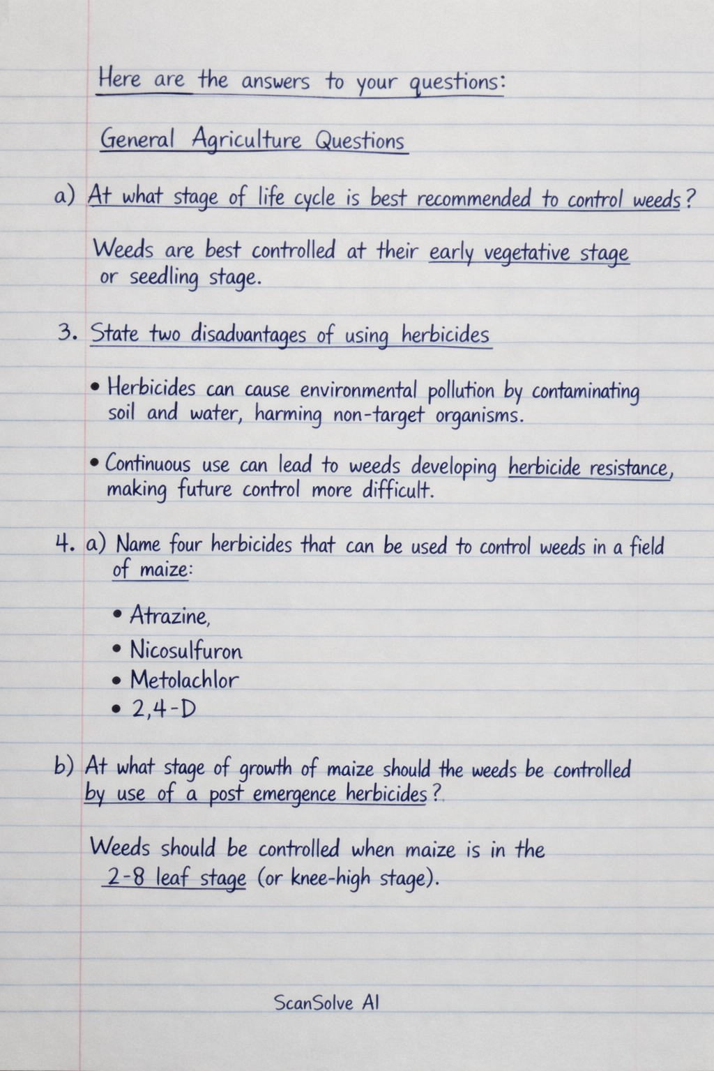 4. a) Name four herbicides that can be used to control weeds in a field of maize • Atrazine • Nicosulfuron • Metolachlor • 2,4-D