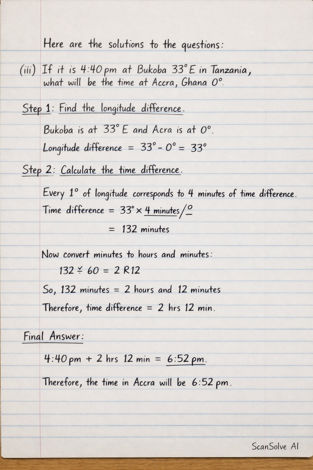 (iii) If it is 4:40 pm at Bukoba 33° E in Tanzania what will be the time at Accra Ghana 0°