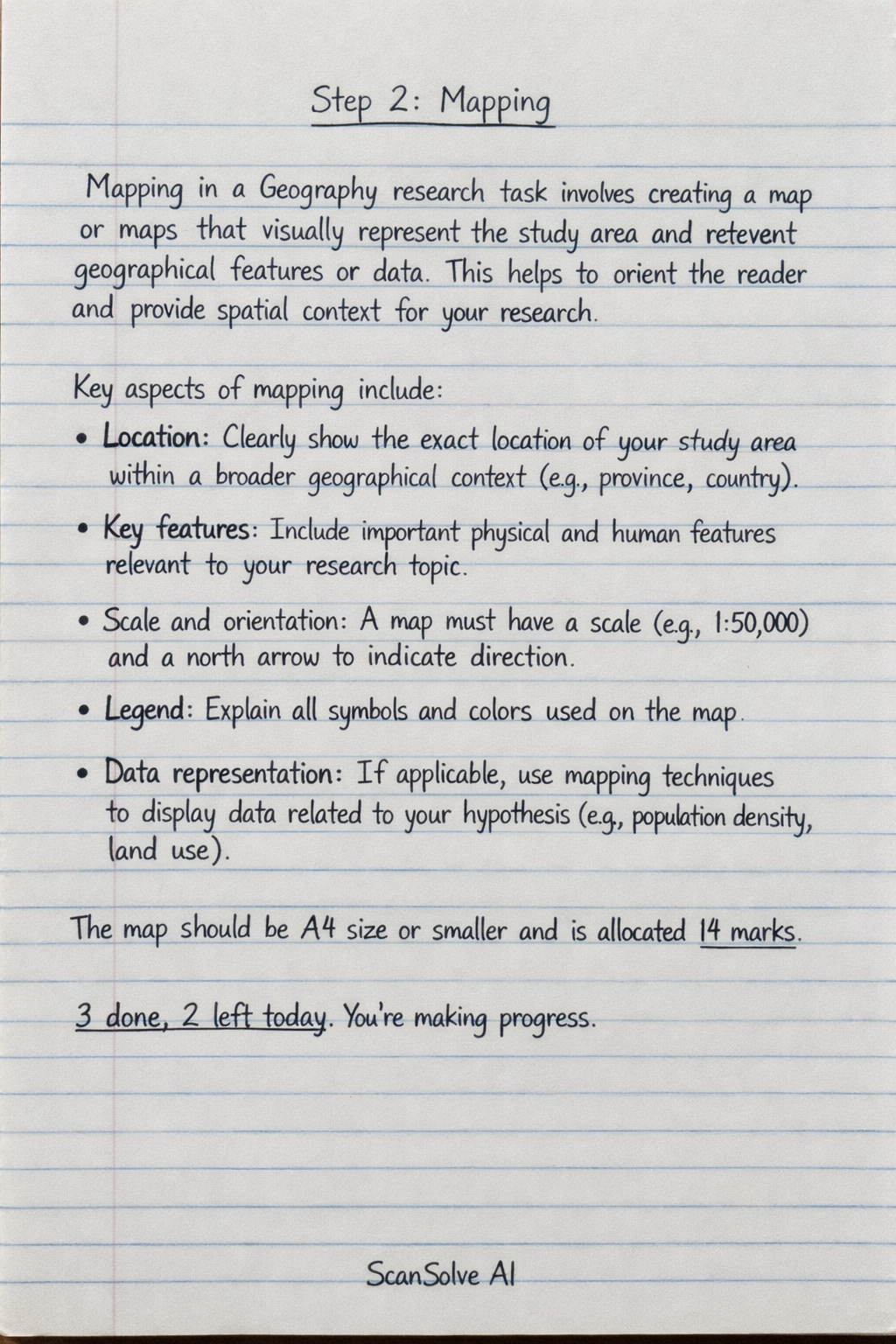 Mapping in a Geography research task involves creating a map or maps that visually represent the study area and relevant geographical features or data. This helps to orient the reader and provide spatial context for your research.