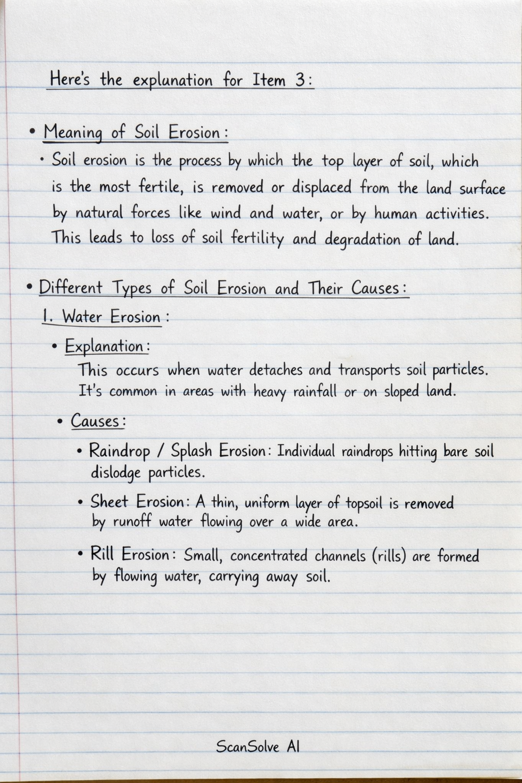 Here's the explanation for Item 3: Meaning of Soil Erosion: Soil erosion is the process by which the top layer of soil, which is the most fertile, is removed or displaced from the land surface by natural forces like wind and water, or by human act…