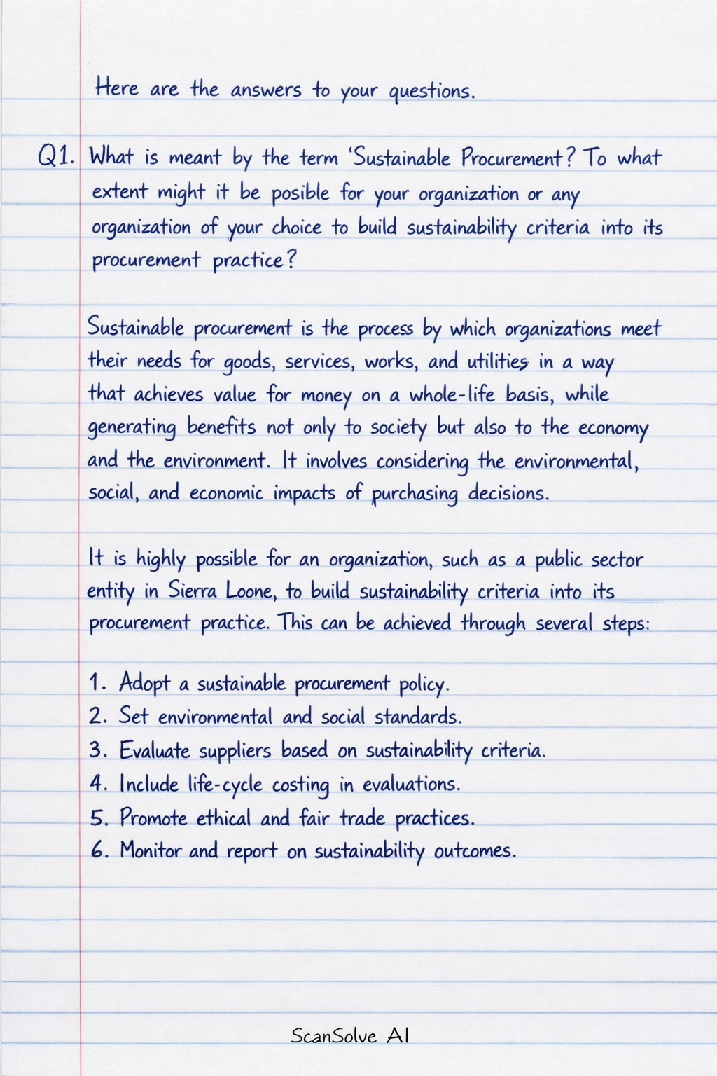 Q1. What is meant by the term "Sustainable Procurement"? To what extent might it be possible for your organization or any organization of your choice to build sustainability criteria into its procurement practice?