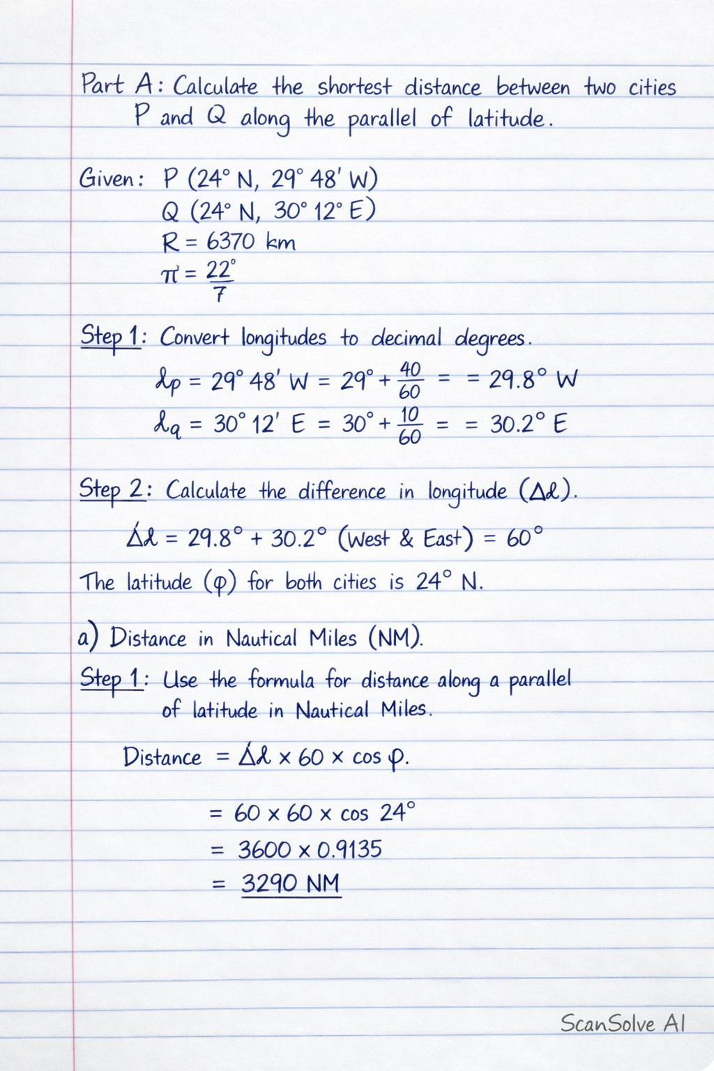 Part A: Calculate the shortest distance between two cities P and Q along the parallel of latitude.