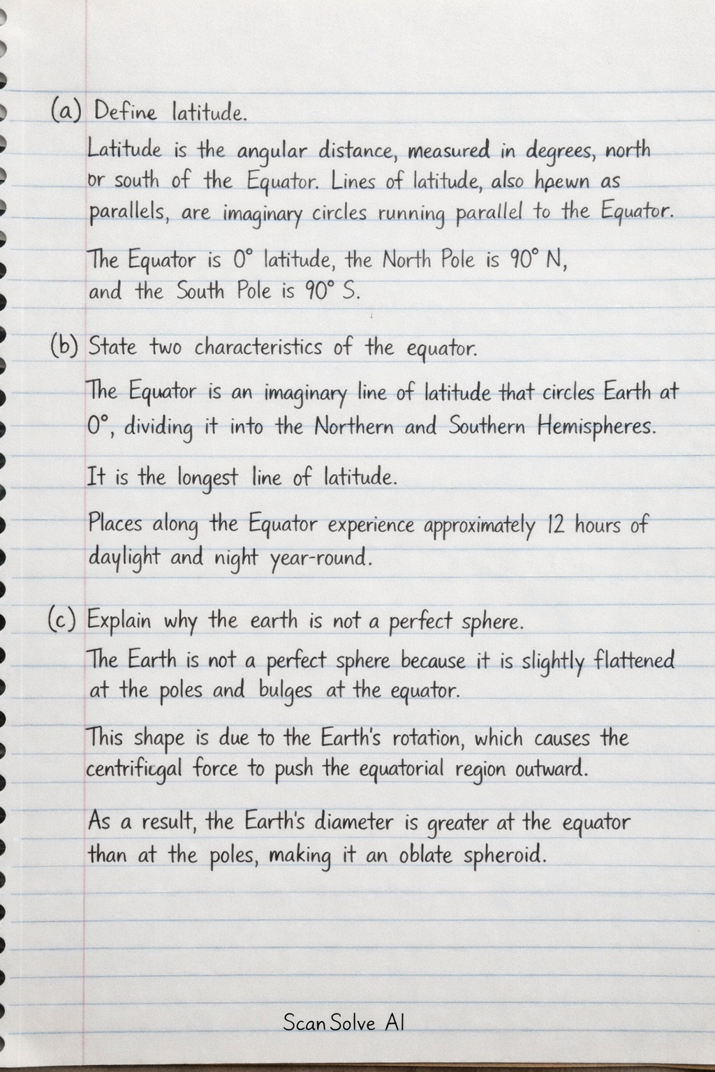 c) Explain why the earth is not a perfect sphere. The Earth is not a perfect sphere primarily due to its rotation. The centrifugal force generated by this rotation causes the Earth to bulge at the Equator and flatten at the poles, resulting in a shape known as an oblate spheroid. Additionally, the Earth's surface is irregular due to variations in topography like mountains and ocean trenches.