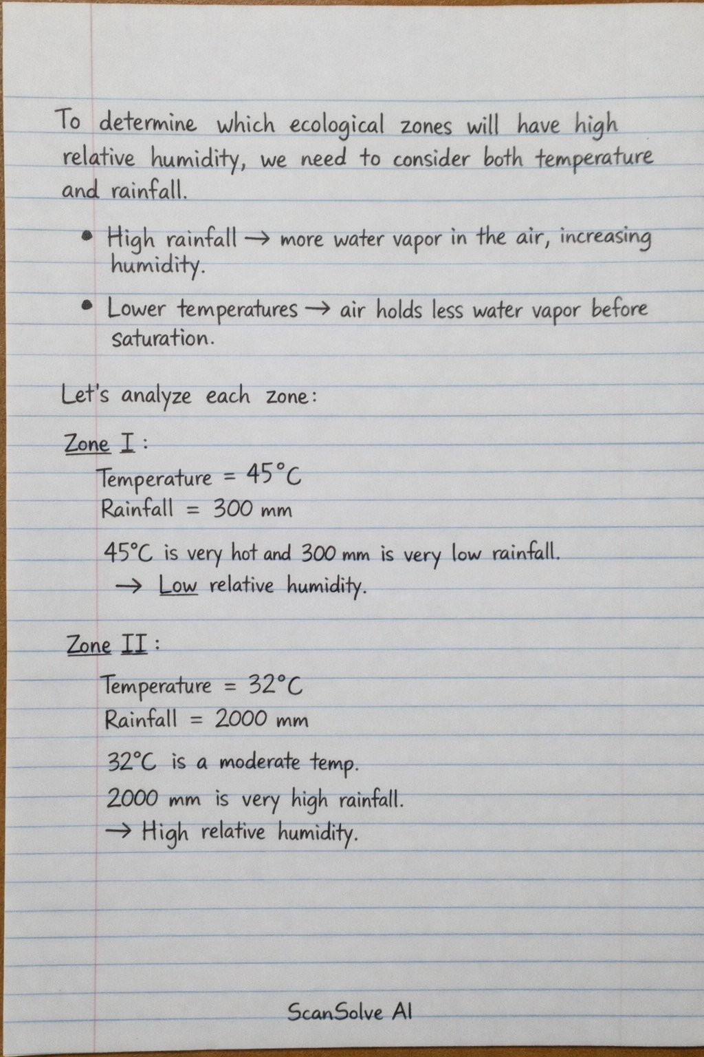 To determine which ecological zones will have high relative humidity, we need to consider both temperature and rainfall.