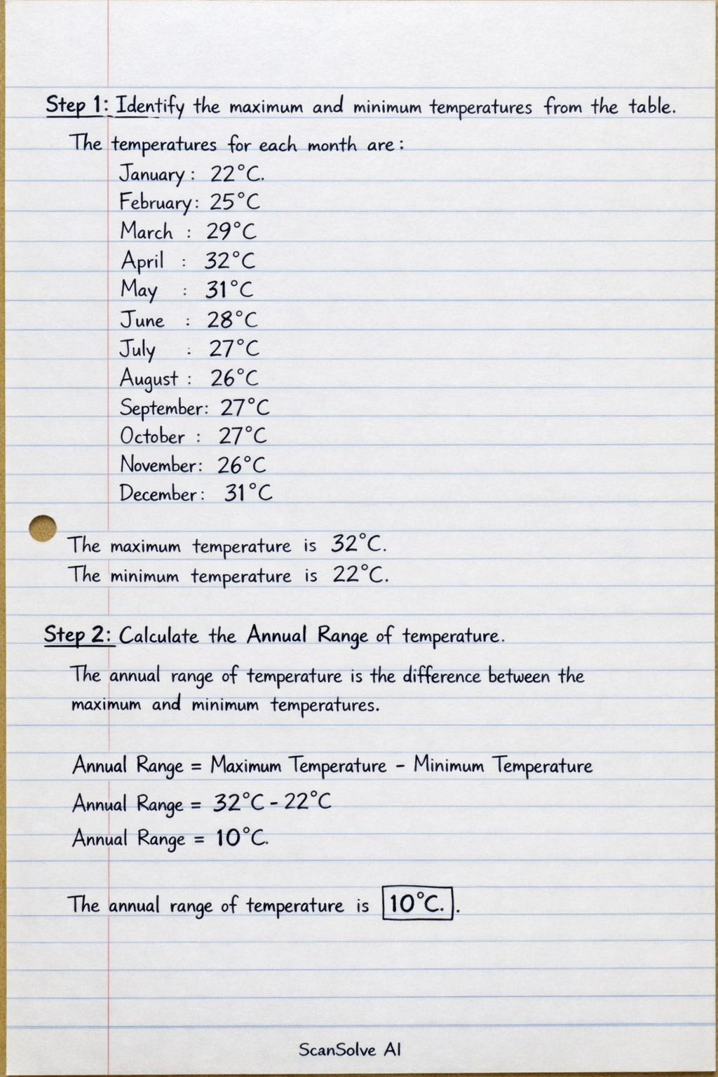 Step 2: Calculate the Annual Range of temperature.