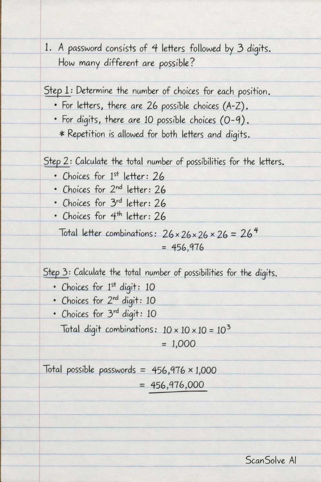 1. A password consists of 4 letters followed by 3 digits. How many different are possible?