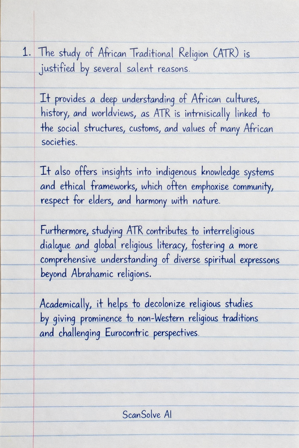 The study of African Traditional Religion (ATR) is justified by several salient reasons. It provides a deep understanding of African cultures, history, and worldviews, as ATR is intrinsically linked to the social structures, customs, and values of many African societies. It also offers insights into indigenous knowledge systems and ethical frameworks, which often emphasize community, respect for elders, and harmony with nature. Furthermore, studying ATR contributes to interreligious dialogue and global religious literacy, fostering a more comprehensive understanding of diverse spiritual expressions beyond Abrahamic religions. Academically, it helps to decolonize religious studies by giving prominence to non-Western religious traditions and challenging Eurocentric perspectives.