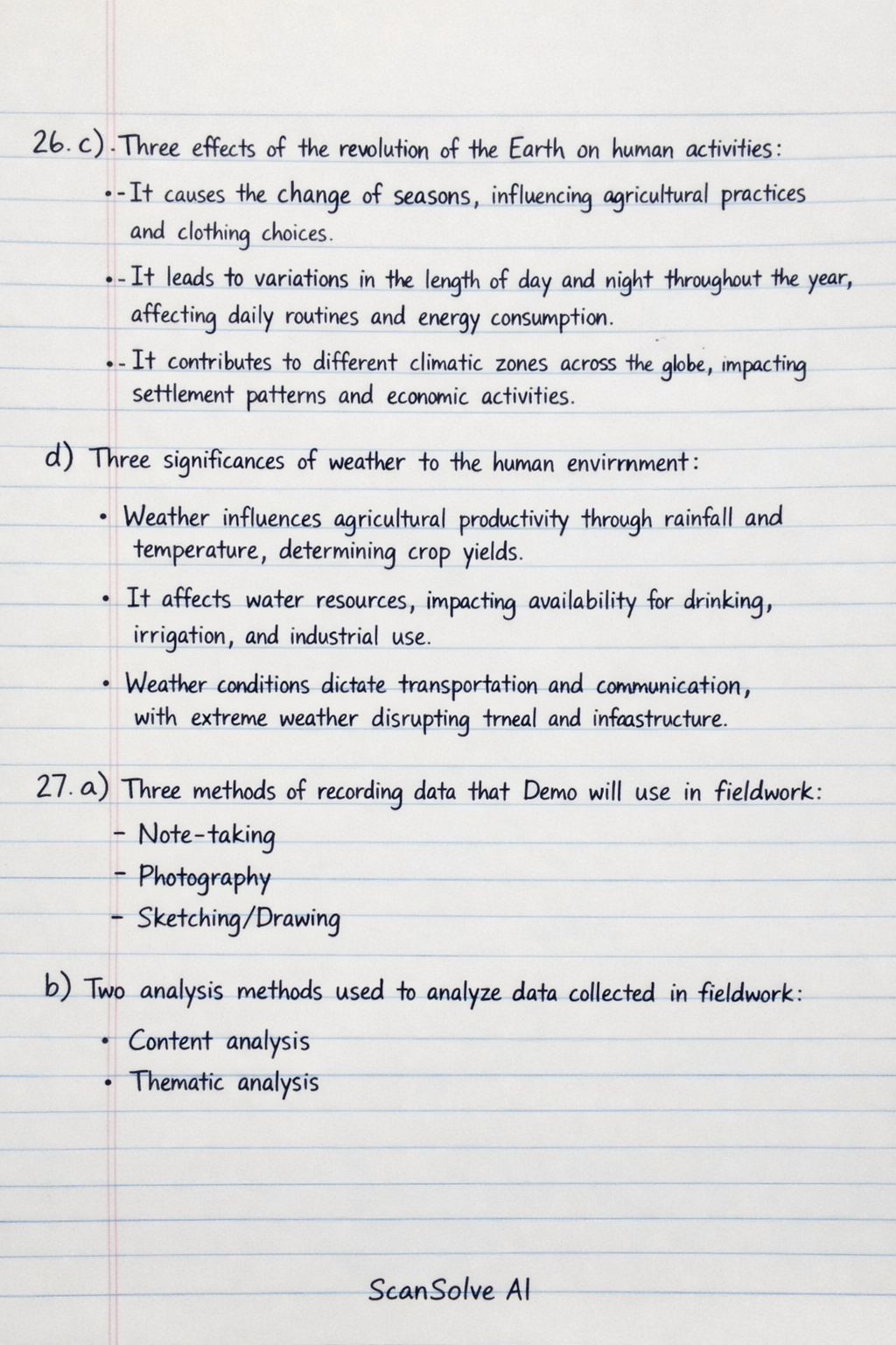 26. c) Three effects of the revolution of the Earth on human activities: