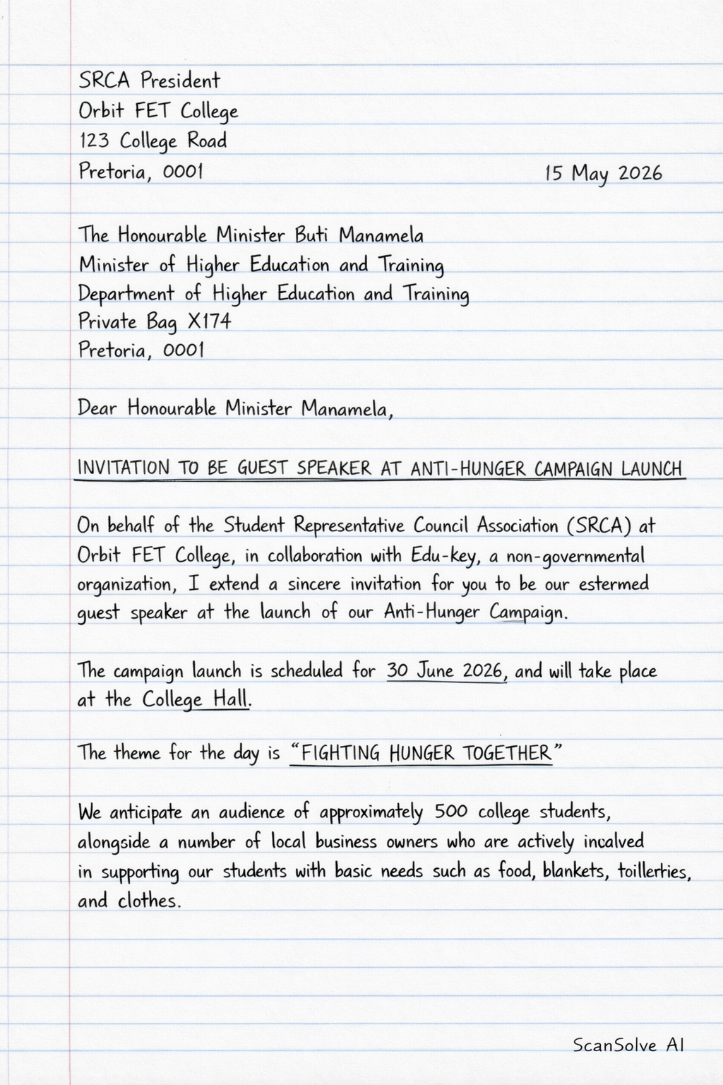 On behalf of the Student Representative Council Association (SRCA) at Orbit FET College, in collaboration with Edu-key, a non-governmental organization, I extend a sincere invitation for you to be our esteemed guest speaker at the launch of our Anti-Hunger Campaign.