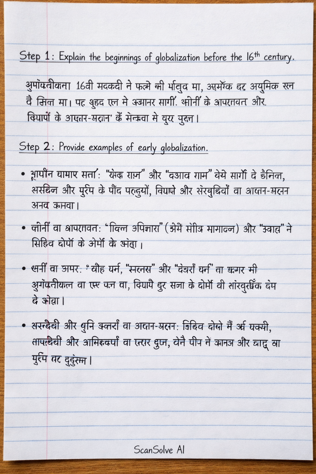 Step 2: Provide examples of early globalization. • प्राचीन व्यापार मार्ग: रेशम मार्ग और मसाला मार्ग जैसे मार्गों ने एशिया, अफ्रीका और यूरोप के बीच वस्तुओं, विचारों और संस्कृतियों का आदान-प्रदान संभव बनाया। • लोगों का आवागमन: विजय अभियानों (जैसे मंगोल साम्राज्य) और प्रवास ने विभिन्न क्षेत्रों के लोगों को जोड़ा। • धर्मों का प्रसार: बौद्ध धर्म, इस्लाम और ईसाई धर्म का प्रसार भी भूमंडलीकरण का एक रूप था, जिसने दूर-दराज के क्षेत्रों को सांस्कृतिक रूप से जोड़ा। • तकनीकी और कृषि उत्पादों का आदान-प्रदान: विभिन्न क्षेत्रों में नई फसलों, तकनीकों और आविष्कारों का प्रसार हुआ, जैसे चीन से कागज और बारूद का यूरोप तक पहुँचना।