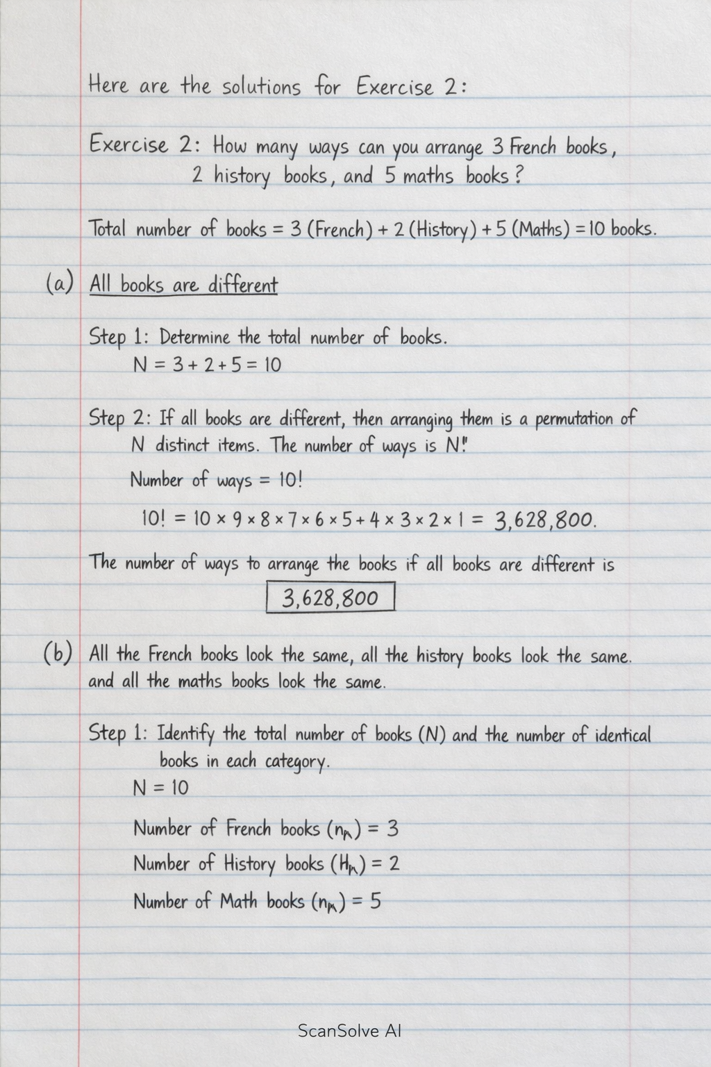 Exercise 2: How many ways can you arrange 3 French books, 2 history books, and 5 maths books?