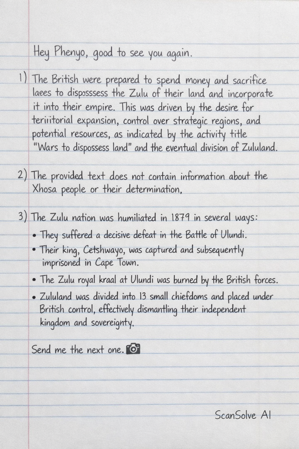 3) The Zulu nation was humiliated in 1879 in several ways: • They suffered a decisive defeat in the Battle of Ulundi. • Their king, Cetshwayo, was captured and subsequently imprisoned in Cape Town. • The Zulu royal kraal at Ulundi was burned by the British forces. • Zululand was divided into 13 small chiefdoms and placed under British control, effectively dismantling their independent kingdom and sovereignty.