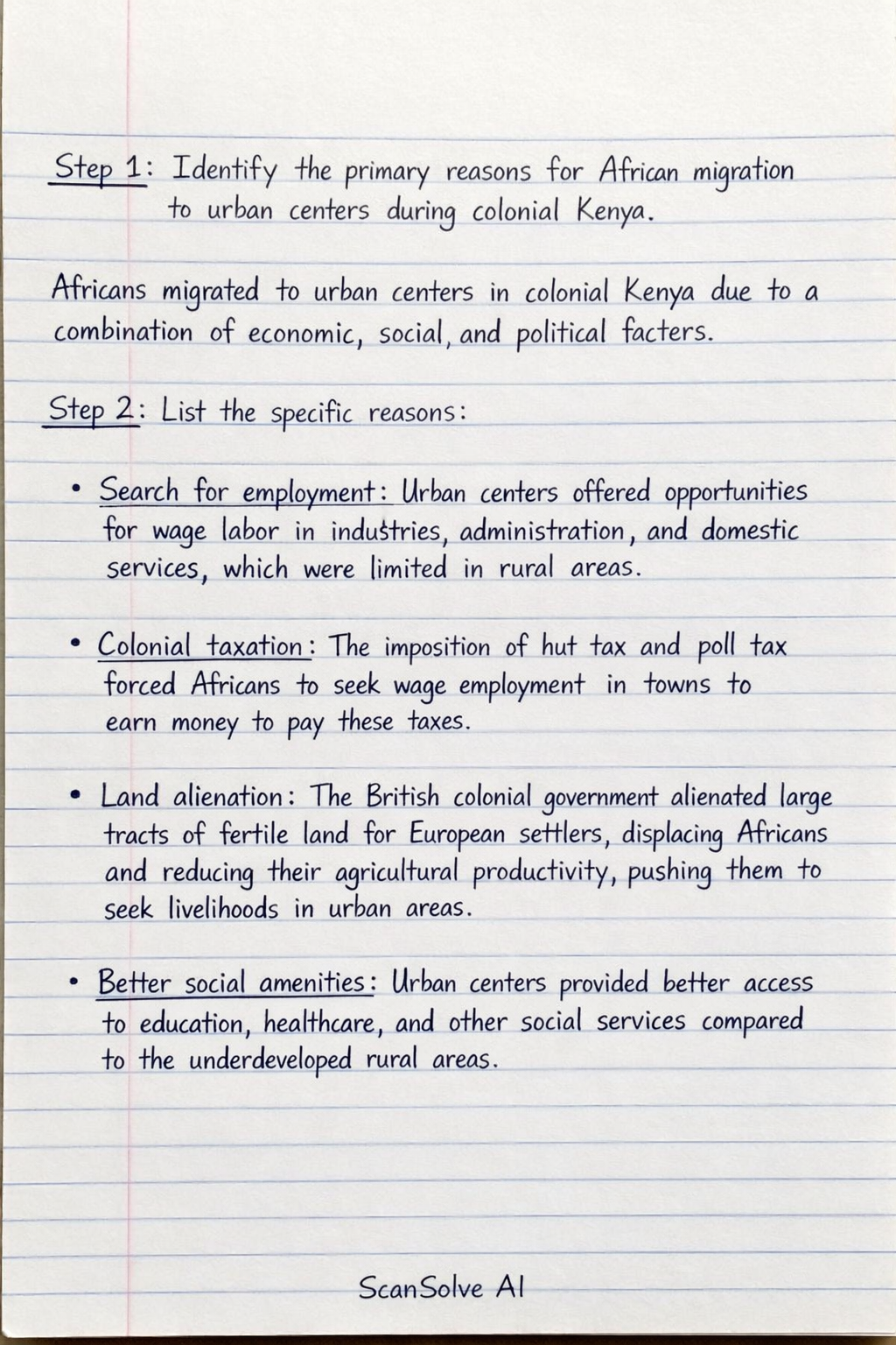 Step 2: List the specific reasons. • Search for employment: Urban centers offered opportunities for wage labor in industries, administration, and domestic services, which were limited in rural areas. • Colonial taxation: The imposition of hut tax and poll tax forced Africans to seek wage employment in towns to earn money to pay these taxes. • Land alienation: The British colonial government alienated large tracts of fertile land for European settlers, displacing Africans and reducing their agricultural productivity, pushing them to seek livelihoods in urban areas. • Better social amenities: Urban centers provided better access to education, healthcare, and other social services compared to the underdeveloped rural areas. • Escape from forced labor and harsh rural conditions: Some Africans migrated to escape forced labor demands on settler farms and the general harsh conditions and restrictions imposed in rural reserves.