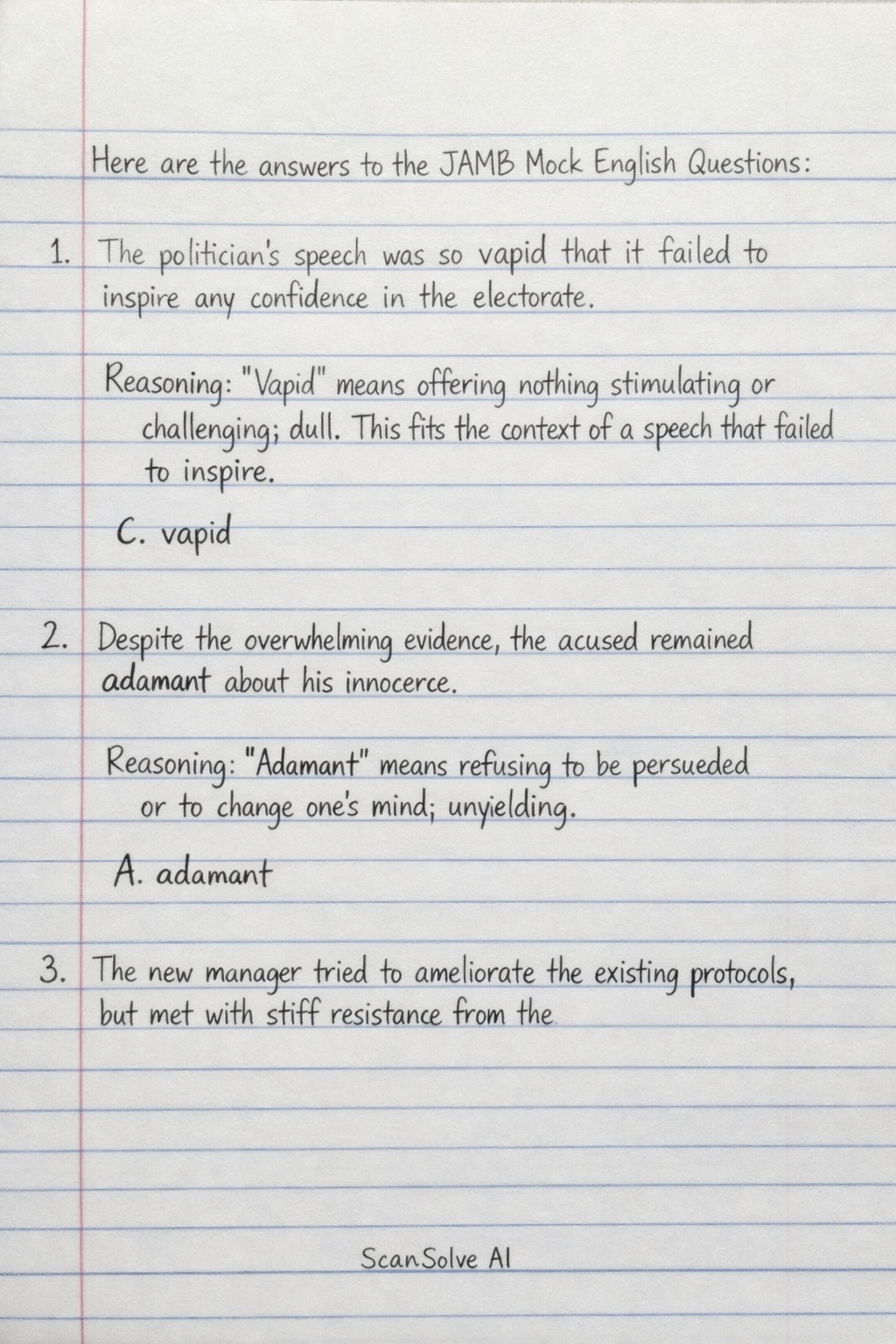 JAMB MOCK ENGLISH QUESTIONS, 20 QUESTIONS 1. The politician's speech was so that it failed to inspire any confidence in the electorate. A. eloquent B. poignant C. vapid D. trenchant E. lucid 2. Despite the overwhelming evidence, the accused remained about his innocence. A. adamant B. complacent C. diffident D. ambivalent 3. The new manager tried to the existing protocols, but met with stiff resistance from the veteran staff. A. ameliorate B. exacerbate C. obliterate D. circumvent 4. His remarks during the debate earned him a reputation as a formidable orator. A. innocuous B. caustic C. benign D. insipid 5. The committee decided to the meeting until further notice due to unforeseen circumstances. A. adjourn B. prorogue C. defer D. postpone E. all of the above 6. The old man, known for his nature, rarely spoke unless directly addressed. A. garrulous B. loquacious C. taciturn D. voluble 7. The incessant noise from the construction site began to on my nerves. A. grate B. grind C. gnaw D. rasp 8. If I you, I that offer immediately. A. was / would accept B. were / would accept C. am / will accept D. had been / would have accepted 9. Neither the students nor their teacher aware of the impending strike. A. is B. are C. were D. have been 10. The principal, accompanied by his vice, to address the assembly. A. is coming B. are coming C. were coming D. have come 11. He asked me I could lend him my textbook. A. that B. if C. whether D. B or C 12. The old woman her living by selling vegetables in the market. A. earns B. makes C. gets D. acquires 13. The criminal was finally brought after a long chase. A. to book B. to justice C. to terms D. to light 14. To "bury the hatchet" means to . A. hide a weapon B. end a quarrel C. prepare for war D. dig a grave 15. The new policy was met with a lot of from the public. A. approbation B. opprobrium C. adulation D. commendation SECTION B: ORAL ENGLISH INSTRUCTIONS: In questions 16-18, choose the word that has a different stress pattern from the others. 16. A. record B. record C. present D. present E. conduct 17. A. photograph B. photography C. photographer D. photographic 18. A. democracy B. aristocrat C. economy D. biology INSTRUCTIONS: In questions 19-20, choose the word that has the same vowel sound as the underlined letters. 19. ought A. bought B. drought C. stout D. route 20. pleasure A. measure B. leisure C. treasure D. A and C Share to Others π₯π₯π₯ I need answers