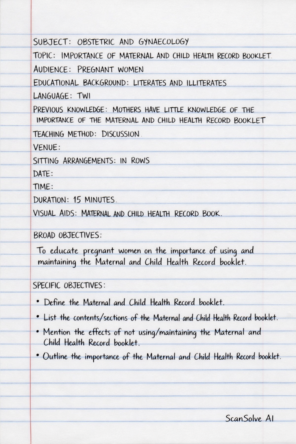 kindly prepare a health education talk using the same format with the topic Importance of Maternal and Child Health Record booklet SUBJECT: OBSTETRIC AND GYNAECOLOGY TOPIC: IMPORTANCES OF ATTENDING ANC AUDIENCE: PREGNANT WOMEN EDUCATIONAL BACKGROUND: LITRATES AND ILLTRATES LANGUAGE: TWI PREVIOUS KNOWLEDGE: MOTHERS HAVE LITTLE KNOWLEDGE OF THE IMPORTANCE OF ATTENDING ANC TEACHING METHOD: DISCUSSION VENUE: SITTING ARRANGEMENTS: IN ROWS DATE: TIME: DURATION: 15 MINUTES VISUAL AIDS: MATERNAL AND CHILD HEALTH RECORD BOOK BROAD OBJECTIVES: To educate pregnant women on the importance of attending antenatal care SPECIFIC OBJECTIVES Define Antenatal care List the activities of antenatal care Mention the effects of not attending Antenatal care Outline the importance of antenatal care INTRODUCTION My name is Rita Braimah, a student from KAAF university college. I’m here with you this morning to discuss about the importance of attending Antenatal care. I chose this topic because most of us go for ANC because we want to know the ages of the pregnancy. In the course of our discussion, we will know what Antenatal care is, activities done at ANC, effects of not attending ANC and importance of antenatal care. Chance will be given for questions and appropriate answers will be provided. BODY Antenatal care (ANC) can be defined as the care provided by skilled health-care professionals to pregnant women in order to ensure the best health conditions for both mother and baby during pregnancy ACTIVITIES CARRIED OUT IN THE ANTENATAL CLINIC Pls what are some of the activities we do when we come for ANC, Initial assessment: During the first visit, healthcare providers conduct an initial assessment, which involves collecting detailed medical history, including any pre-existing health conditions, previous pregnancies, and family medical history. They may also perform a physical examination and order baseline tests, such as blood tests and urine analysis. Palpation of the abdomen; this is done to know the the fundal height, presentation and gestation of the pregnancy Fetal monitoring: Monitoring the baby's well-being is an essential part of antenatal care. Healthcare providers may use various techniques to assess fetal development and monitor the baby's heartbeat. This can include using a Doppler device or conducting ultrasound scans at specific stages of pregnancy. Education and counseling: Antenatal clinics provide education and counseling sessions to expectant mothers and their families. These sessions cover a wide range of topics, including nutrition during pregnancy, healthy lifestyle choices, prenatal vitamins, breastfeeding, and preparation for childbirth Medication ; Sp is given to pregnant women to prevent malaria, dewormers are also give to prevent worm infestation. Routine drugs are also give like Folic acid, multivite Vaccinations: Antenatal clinics may administer vaccines that are recommended during pregnancy, such as Tetanus, Diphtheria, vaccine. These vaccines help protect both the mother and the baby from certain Tetanus infection Effects of not attending ANC Pls mothers what are some of the effects of not attending ANC Can prone to pregnancy complications such as preeclampsia, eclampsia . Can lead to low Hemoglobin, anemia It could lead to birth outcomes including preterm birth, low birth weight and stillbirth. IMPORTANCE OF ANTENATAL SERVICES Please mothers, what are the importance of attending antenatal services? Individualized Care and Guidance: Each pregnancy is unique, and attending antenatal clinic allows healthcare providers to offer personalized care and guidance based on your specific needs. Through regular consultations, they can provide advice on nutrition, exercise, and lifestyle. They can address any concerns you may have, offer emotional support, and guide you through the physical and emotional changes that comes with pregnancy. Comprehensive Health Assessment: Attending an antenatal clinic provides an opportunity for healthcare professionals to monitor your health and assess the progress of your pregnancy. Regular check-ups allow the medical team to measure your blood pressure, monitor weight gain, assess fetal growth, and check for any signs of complications. Early detection of potential issues can lead to timely interventions Monitoring Baby's Development: Antenatal clinic visits include various tests and screenings to ensure the healthy development of your baby. These may include ultrasound scans to assess fetal growth, identify any potential abnormalities, and determine the baby's position in the womb. Monitoring the baby's development allows for early detection of any issues and appropriate interventions Prevention and Management of Complications: Attending antenatal clinic enables healthcare providers to identify and manage potential complications promptly. Conditions such as gestational diabetes, preeclampsia, and anemia can be detected through routine tests, and appropriate measures can be taken to minimize their impact on both you and your baby. QUESTION TIME Any question FEEDBACK Please, what have we learnt from this discussion SUMMARY Antenatal care It involves a range of activities and services provided in antenatal clinics to ensure the health and well-being of both the mother and the developing baby. Antenatal clinics conduct initial assessments during the first visit, which include collecting medical history, performing physical examinations, and ordering baseline tests. Regular check-ups are then scheduled to monitor the mother's health, weight gain, and the growth and development of the baby. Antenatal clinics offer screenings and diagnostic tests to identify any risks or complications. Education and counseling sessions are provided to expectant mothers and their families, covering topics like nutrition, healthy lifestyle choices, breastfeeding, and childbirth preparation. Not attending ANC could lead to preterm , still birth. The importance of attending antenatal cl