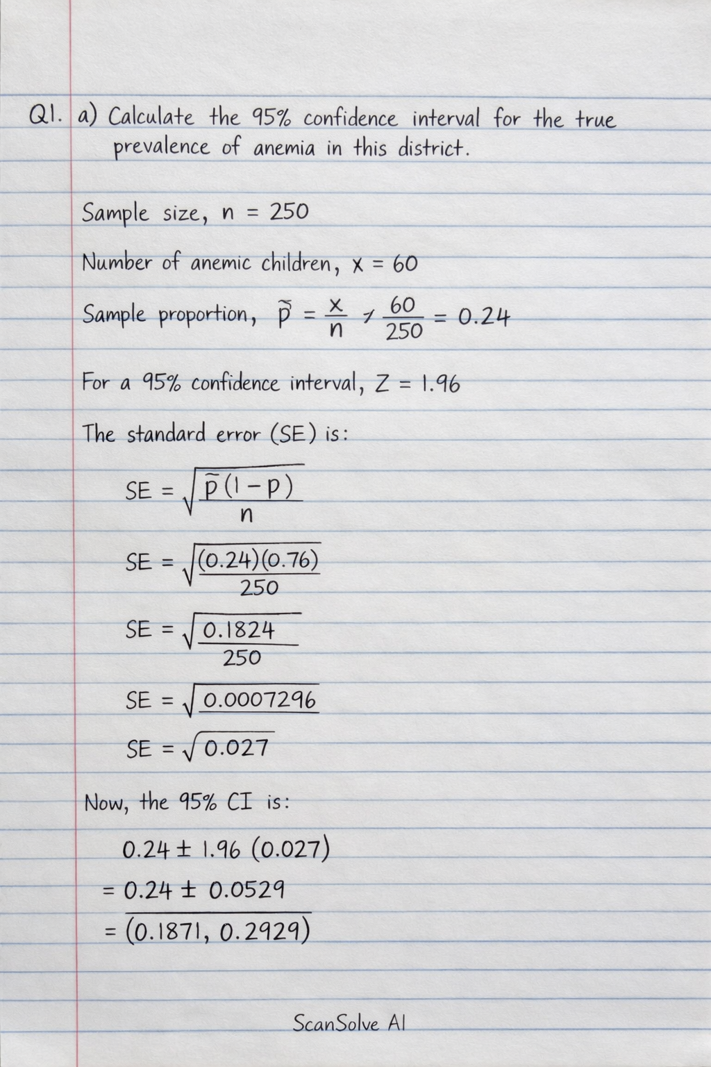 a) Calculate the 95% confidence interval for the true prevalence of anemia in this district.