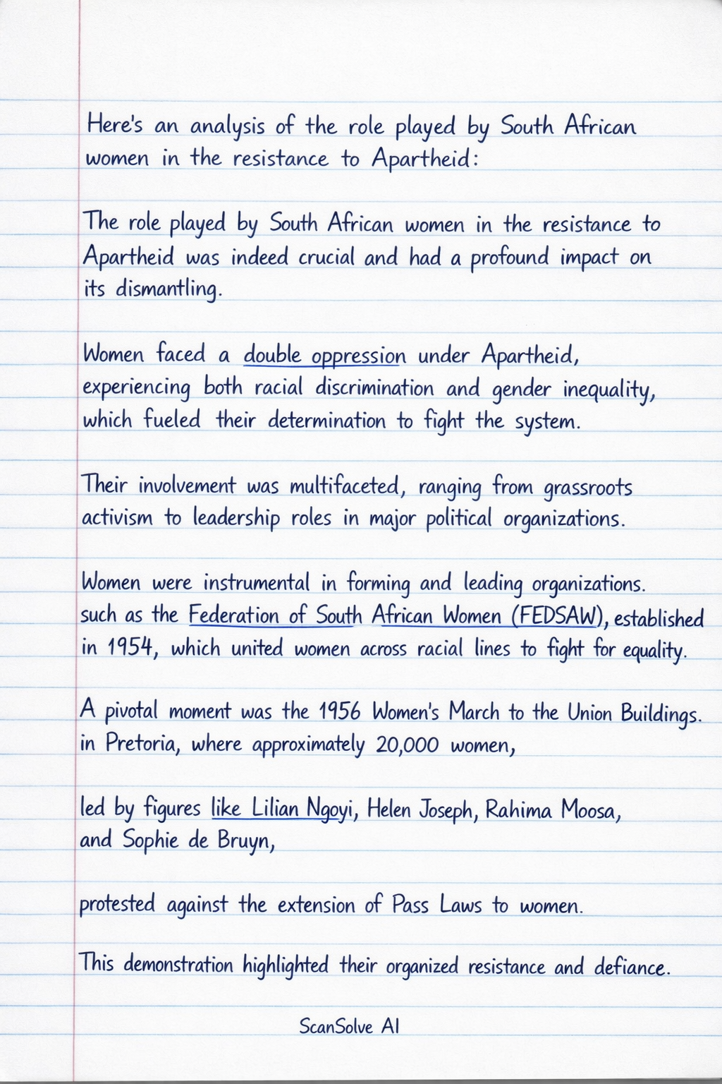 The role played by South African women in the resistance to Apartheid was indeed crucial and had a profound impact on its dismantling. Women faced a double oppression under Apartheid, experiencing both racial discrimination and gender inequality, which fueled their determination to fight the system.