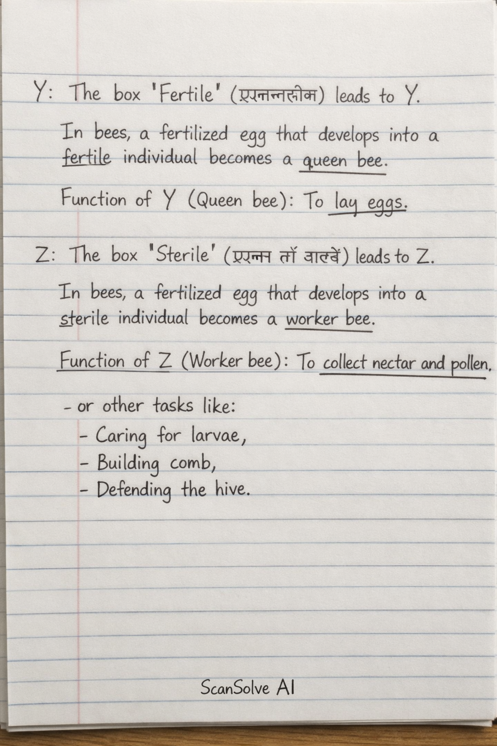 Z: The box "Sterile" (प्रजनन गर्न नसक्ने) leads to Z. In bees, a fertilized egg that develops into a sterile individual becomes a worker bee*.