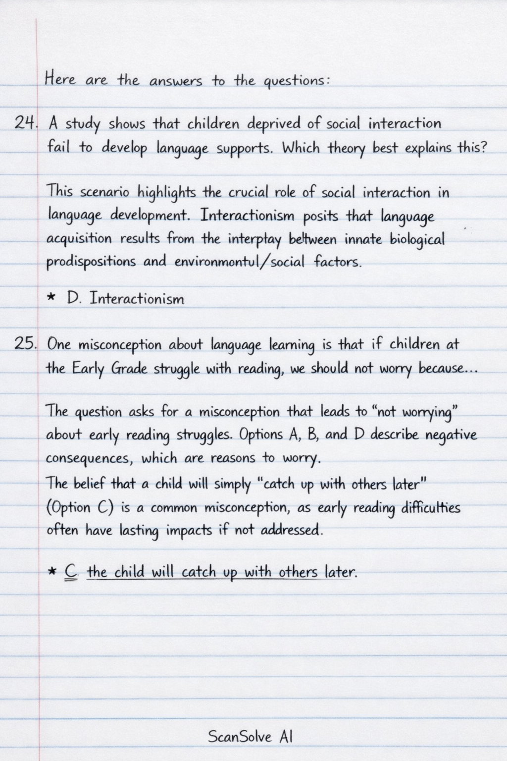 24. A study shows that children deprived of social interaction fail to develop language supports. Which theory best explains this? This scenario highlights the crucial role of social interaction in language development. Interactionism posits that language acquisition results from the interplay between innate biological predispositions and environmental/social factors.